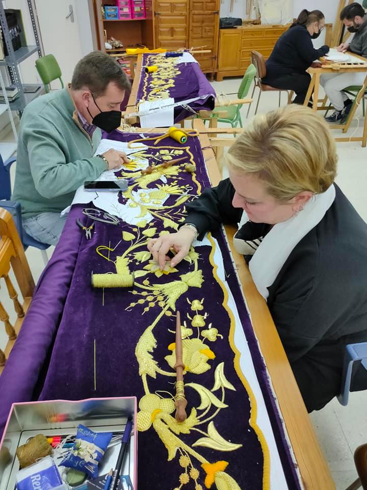 Alumnos y profesora, Cristina Castaño, no paran de trabajar en el taller de bordado en oro, se está elaborando un nuevo manto para la Virgen de los Dolores.