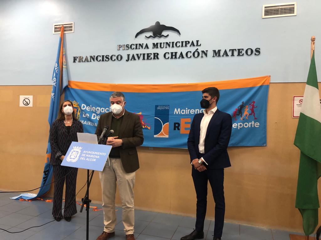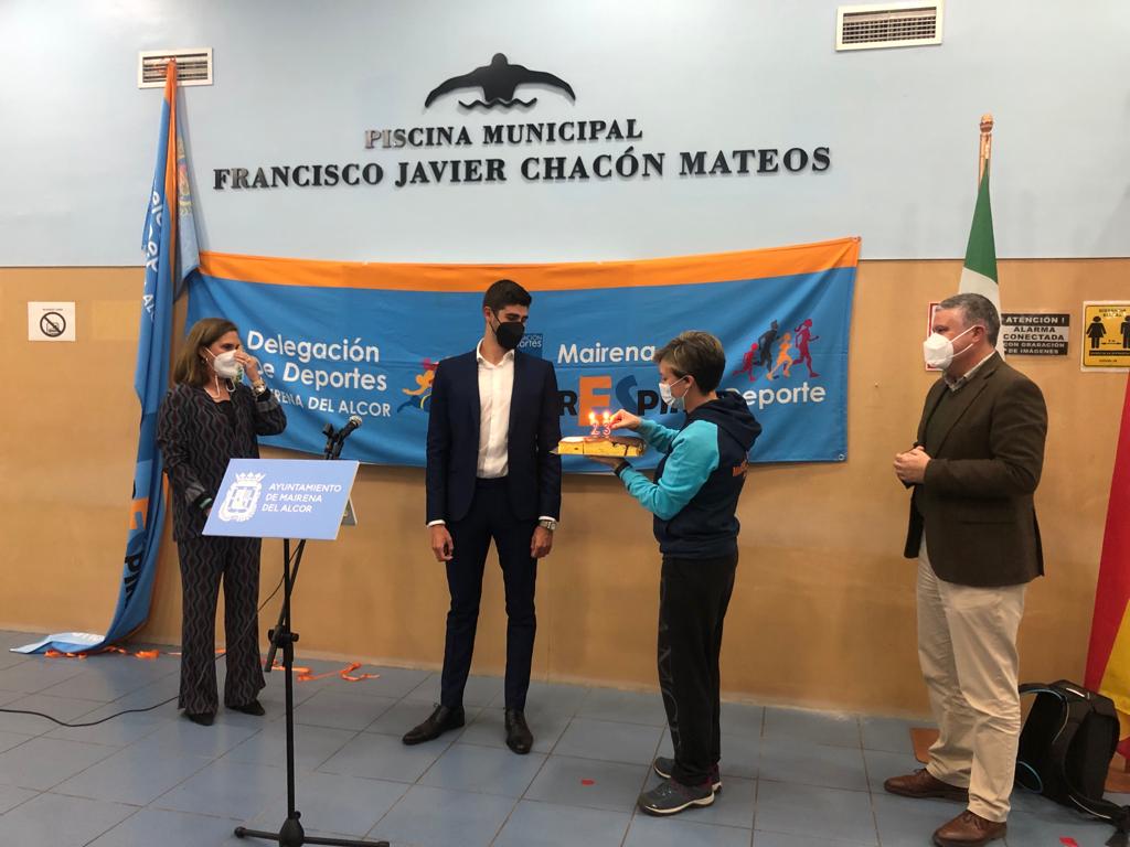 La delegada de Deportes, Inmaculada Galocha, felicitó a Chacón por partida doble "hoy es el cumpleaños de Javier. Así que qué mejor regalo que el homenaje que le rinde su pueblo, Mairena del Alcor, poniendo su nombre a las instalaciones de la piscina cubierta municipal".