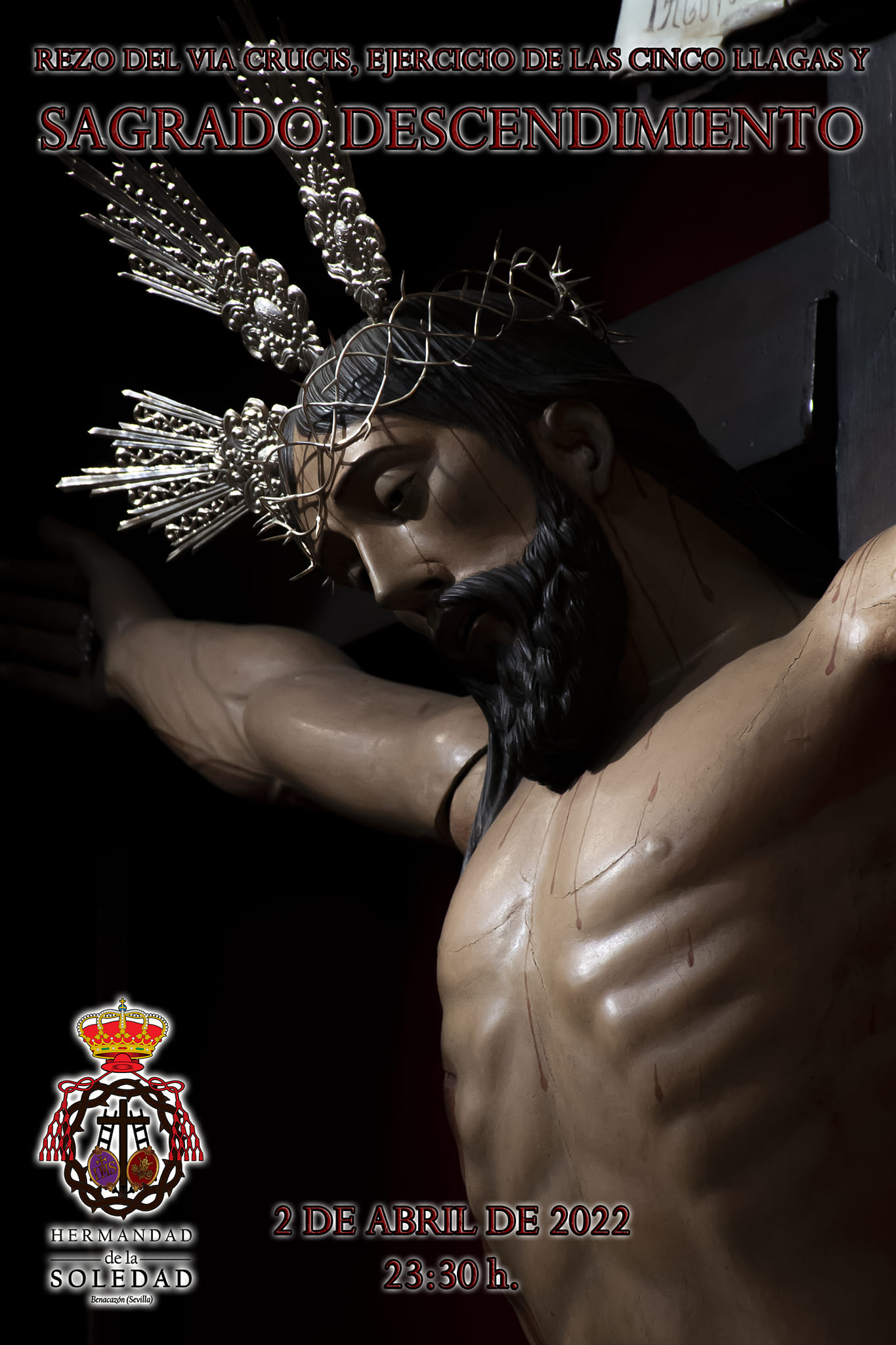 El Ayuntamiento de Benacazón informa que el sábado 2 de abril a las 23:30 h. en la Capilla de la Soledad, tendrá lugar el rezo del Vía Crucis, el Ejercicio de las Cinco Llagas, el Sagrado Descendimiento y el traslado al sepulcro con la venerada imagen del Señor, quedando colocado en su paso procesional para la próxima estación de penitencia del Viernes Santo.