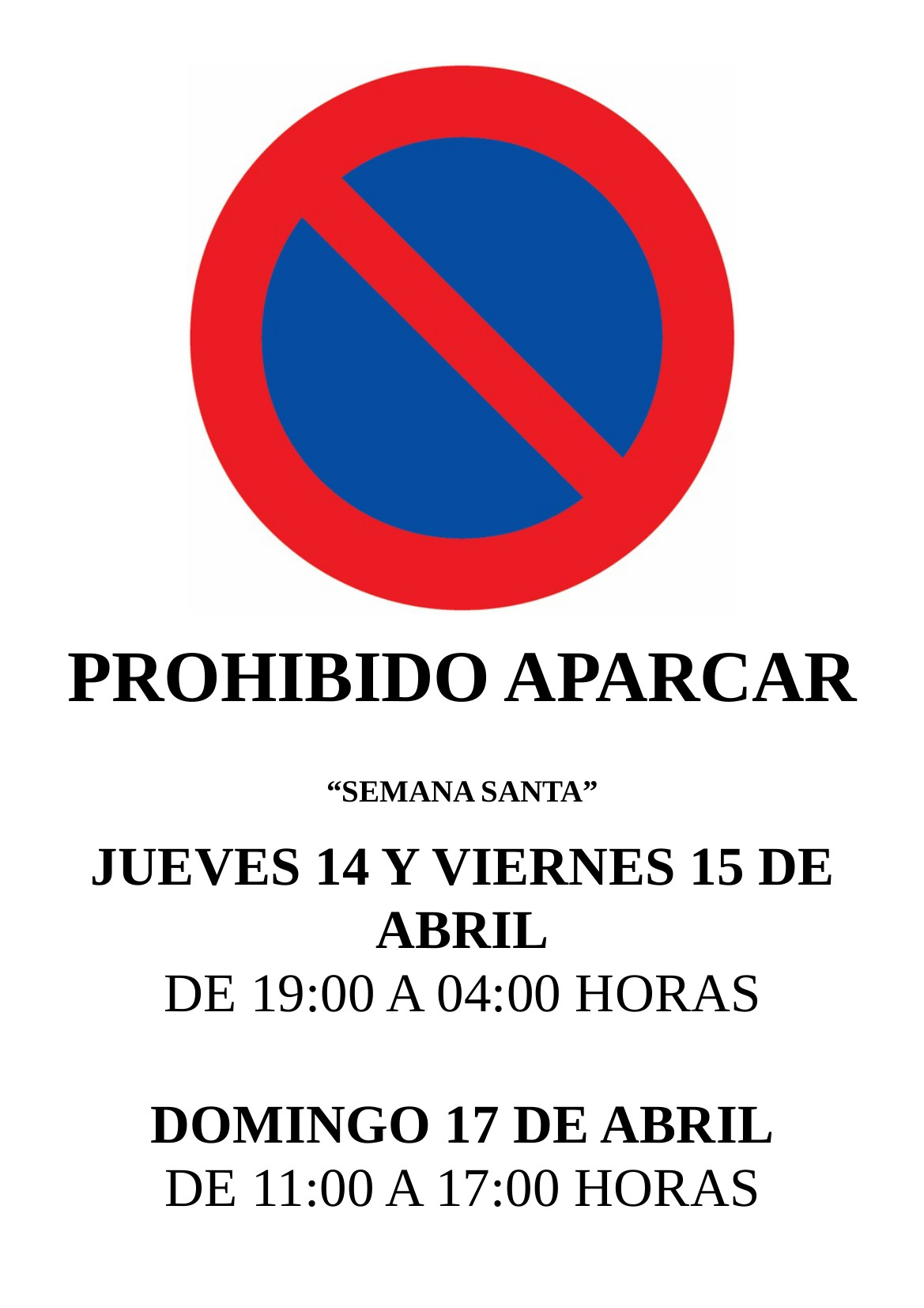 PROHIBIDO ESTACIONAR en el recorrido oficial de la Hermandad de la Soledad de 19:00 a 04:00 horas.