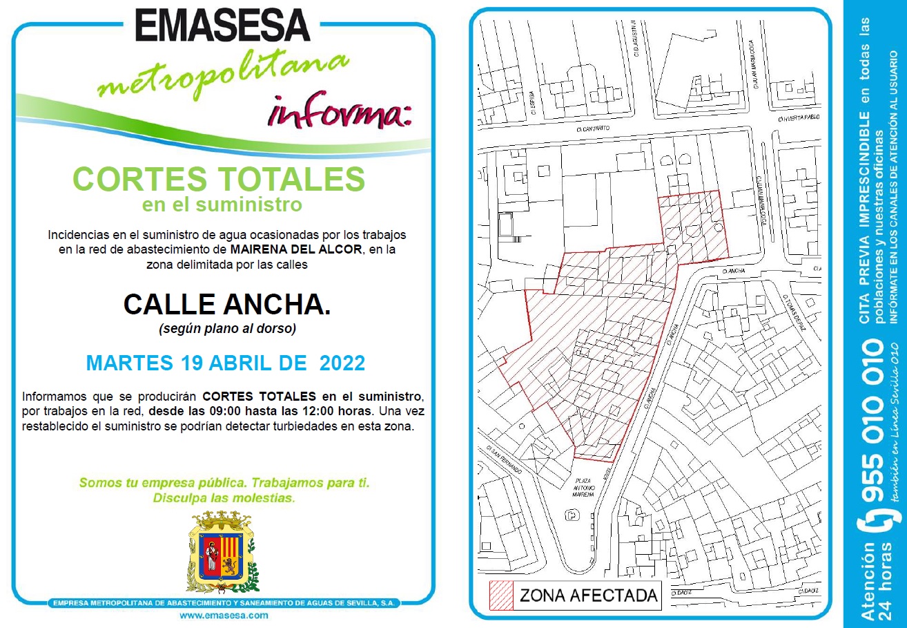 Emasesa Metropolitana informa que por trabajos en la red de abastecimiento, el martes 19 de abril de 9 a 12 horas, en un tramo de la calle Ancha se producirán cortes puntuales en el suministro de agua.