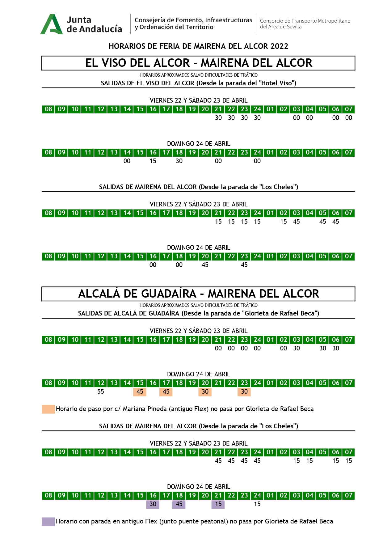 En esta Feria de Abril de Mairena del Alcor también habrá servicio de transporte comarcal para facilitar los desplazamientos desde Alcalá de Guadaíra y el Viso del Alcor hacia Mairena. El horario de salida en el Viso se marca en la parada de Hotel Viso. Desde Mairena en la parada de Los Cheles y las salidas desde Alcalá en la parada ubicada junto a la glorieta Rafael Beca, salvo los sombreados del domingo que son de paso por el antiguo Flex y C/ Mariana Pineda.