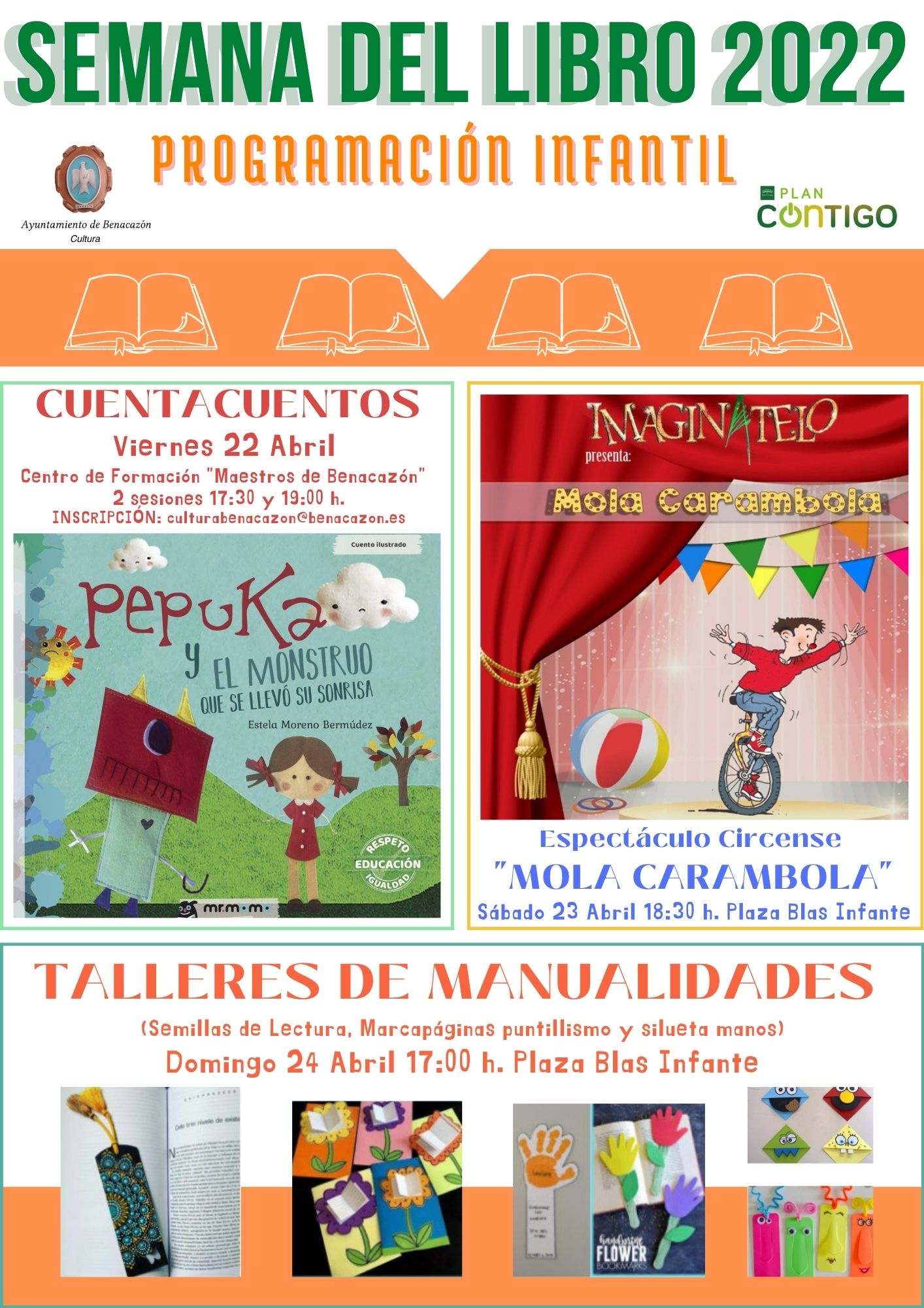 A las 17:00 horas en la Plaza Blas Infante: TALLERES DE MANUALIDADES INFANTILES (Marcapáginas con la técnica del puntillismo, Semillas de lectura y Marcapáginas silueta de la mano).