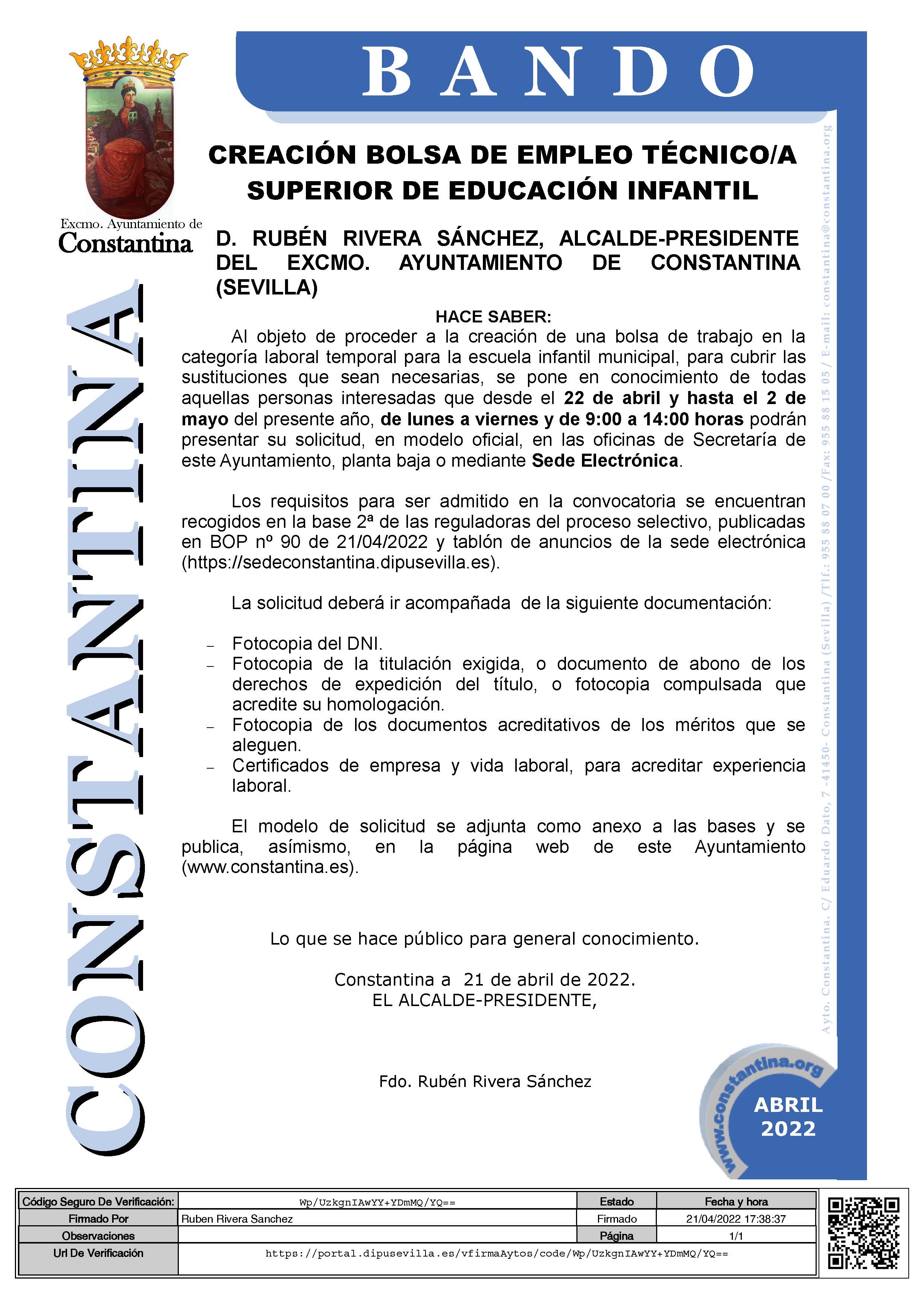 Al objeto de proceder a la creación de una bolsa de trabajo en la categoría laboral temporal para la Escuela Infantil Municipal "El Dado" de Constantina, para cubrir las sustituciones que sean necesarias, se pone en conocimiento de todas aquellas personas interesadas que desde el 22 de abril y hasta el 2 de mayo del presente año, de lunes a viernes y de 9:00 a 14:00 horas podrán presentar su solicitud, en modelo oficial, en las oficinas de Secretaría de este Ayuntamiento, planta baja o mediante Sede Electrónica.