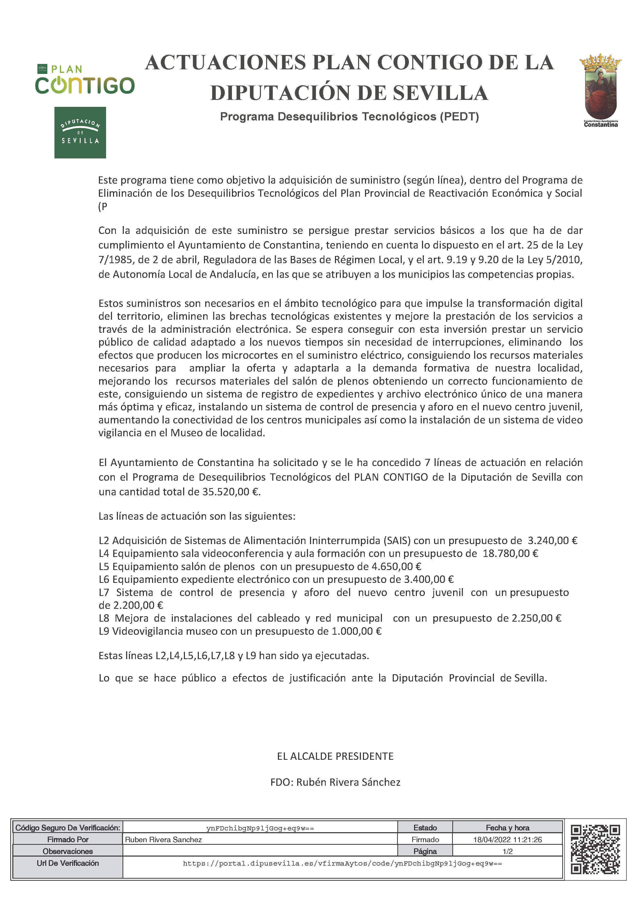 A efectos de justificación ante la Diputación de Sevilla, hacemos públicas las líneas 7 líneas actuación solicitadas, concedidas y ejecutadas al Ayuntamiento Constantina en relación con el Programa de Desequilibrios Tecnológicos del PLAN CONTIGO de Diputación de Sevilla.
