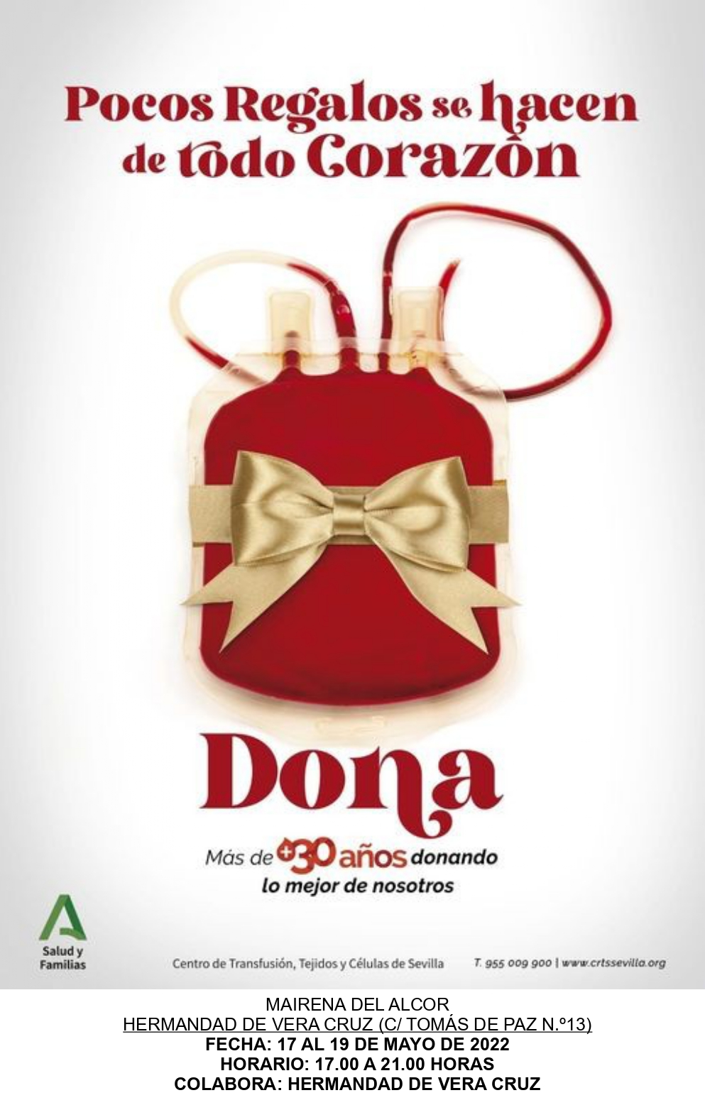 El Centro de Transfusión, Tejidos y Células de Sevilla organiza una nueva campaña de donación de sangre en la casa hermandad de la Vera Cruz (calle Tomás de Paz, 13) los días 17, 18 y 19 de mayo de 17.00 a 21.00 horas.