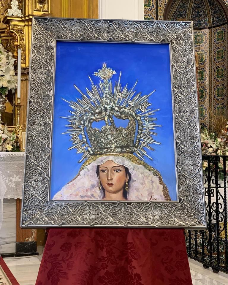 Se presenta el cartel anunciador de la Romería 2022 en la parroquia de Ntra. Sra. del Rosario, el autor Antonio Martín Mata plasma sobre lienzo la figura de la Virgen del Rosario