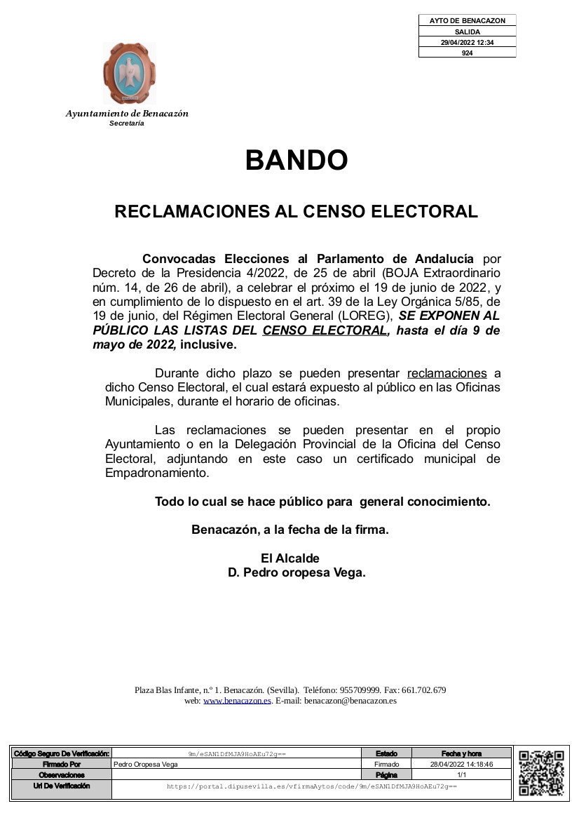 El Ayuntamiento de Benacazón informa sobre la EXPOSICIÓN PÚBLICA DE LAS LISTAS DEL CENSO ELECTORAL, que estarán expuestas hasta el día 9 de mayo de 2022, inclusive, con motivo de las Elecciones al Parlamento de Andalucía convocadas por Decreto de la Presidencia 4/2022, de 25 de abril (BOJA Extraordinario núm. 14, de 26 de abril), para el próximo 19 de junio de 2022.