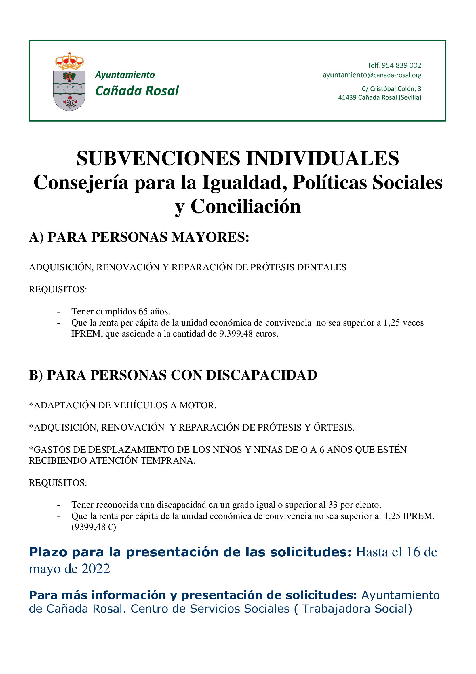 Para más información y presentación de solicitudes: Servicios Sociales del Ayuntamiento de Cañada Rosal (Trabajadora Social).