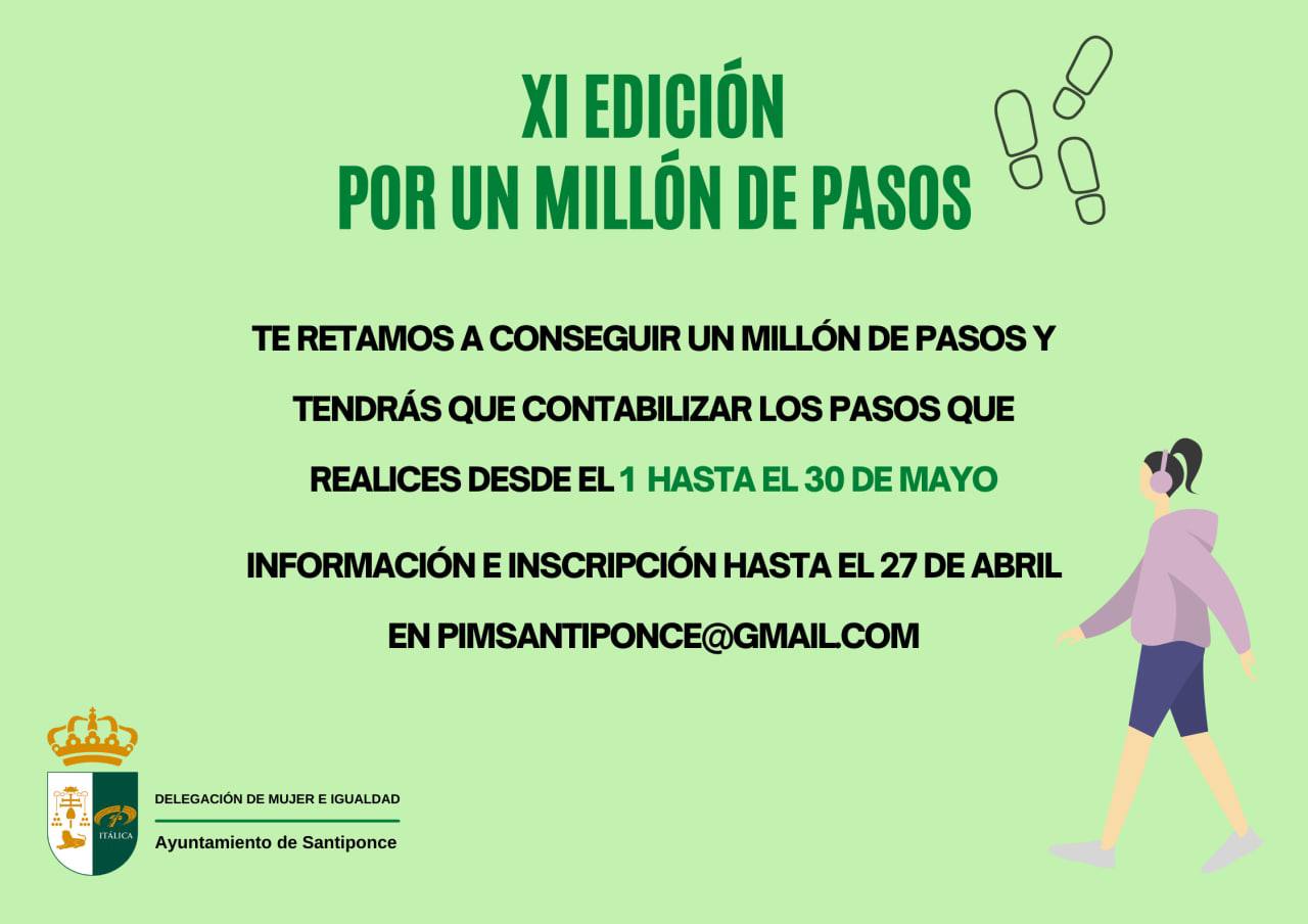 Desde la Delegación de Mujer e Igualdad del Ayuntamiento de Santiponce ponemos en marcha la XI Edición "Por un millón de pasos" desde el 1 hasta el 30 de MAYO.