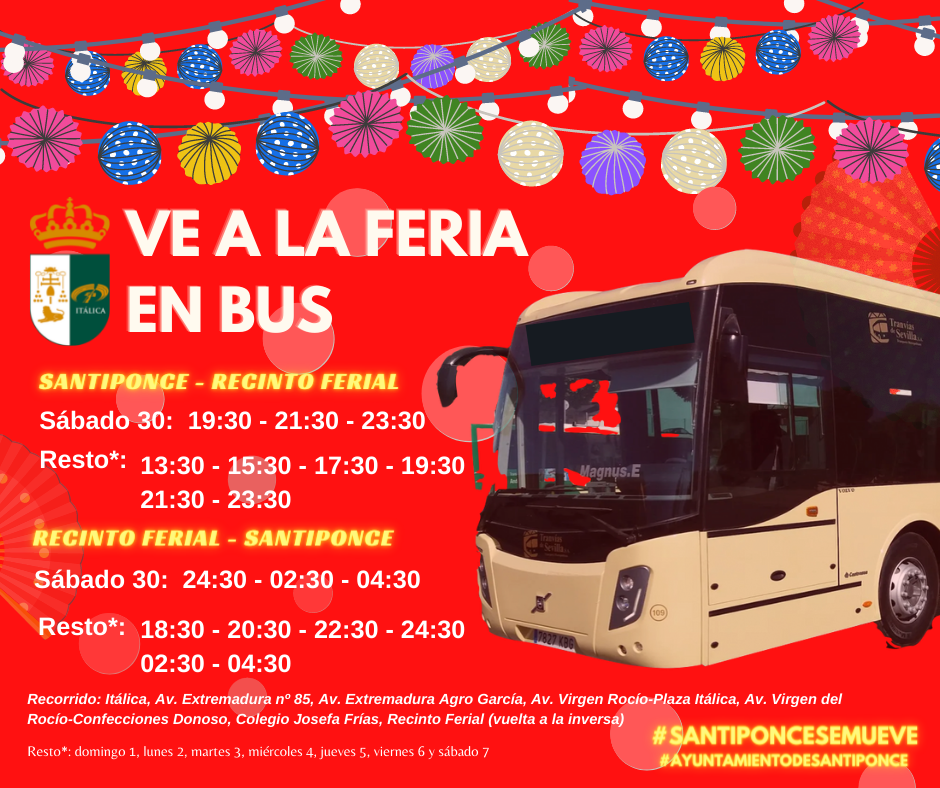 Tras dos años de parón obligado debido a la pandemia, Santiponce contará con un autobús que llevará a los santiponceños a la Feria de Sevilla, desde el sábado 30 de abril y hasta el sábado 7 de mayo, facilitando de este modo el traslado de los vecinos del municipio hasta el Real.