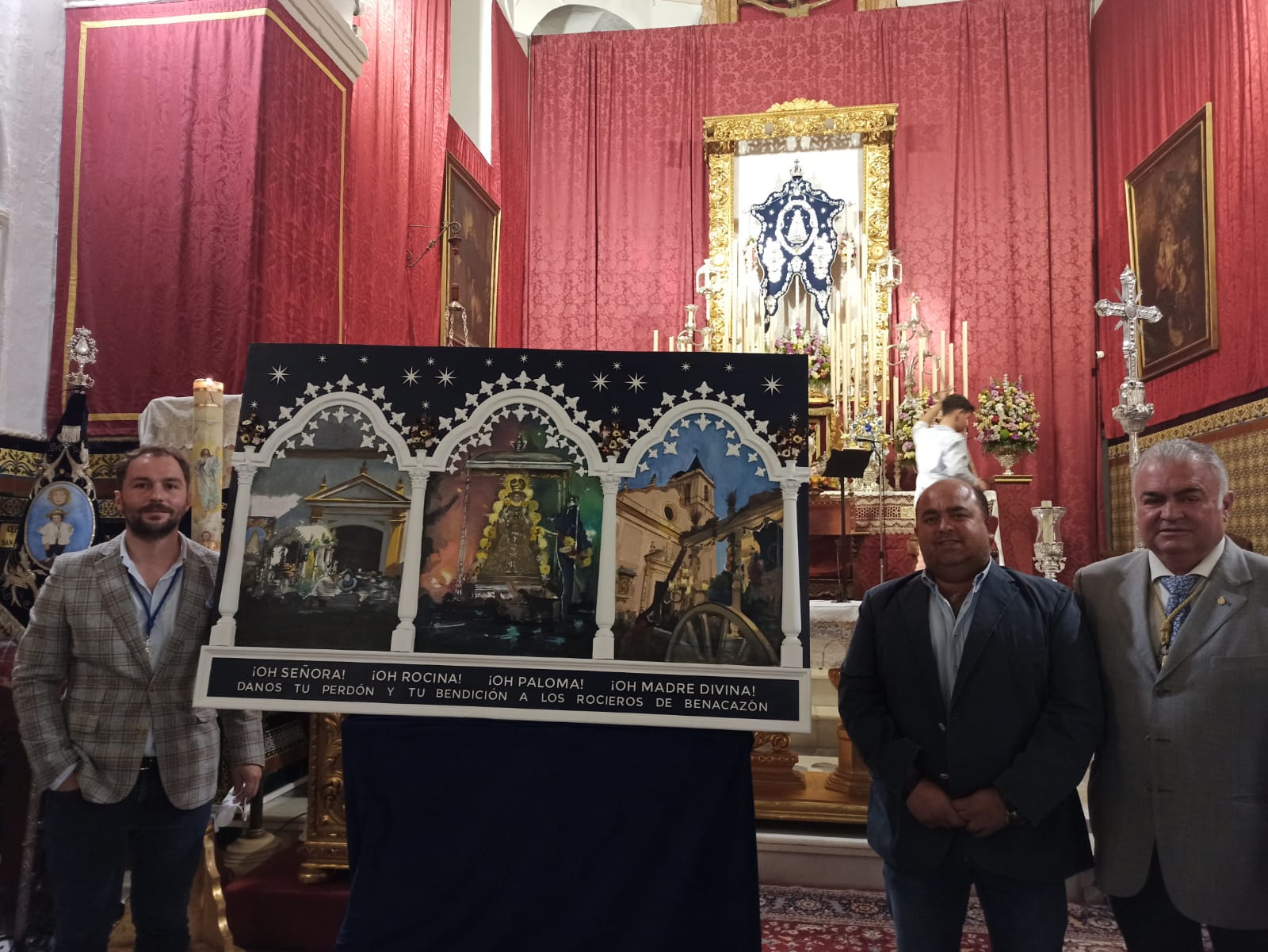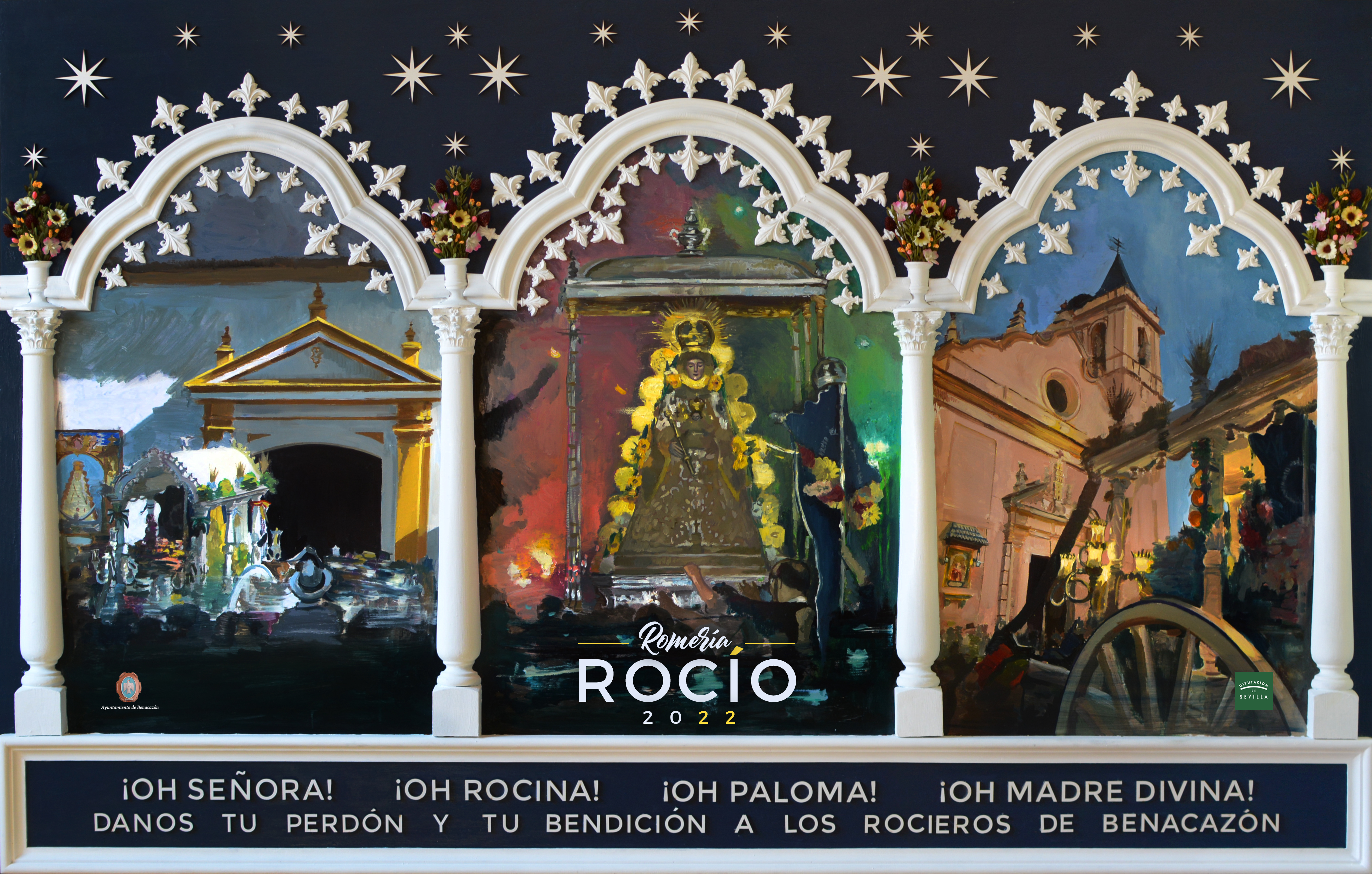"La obra consiste en un tríptico cuyo marco está inspirado en la carreta de la Hermandad del Rocío de Benacazón y su Simpecado. Columnas de madera, capiteles, flores de Lis, las trece estrellas pequeñas y las seis grandes que tiene el Simpecado, así como flores forman el marco que nos presentan las tres pinturas que nos anuncian el Rocío en Benacazón 2022, rematado en la parte inferior con letras de la Salve del Centenario de la Hermandad.