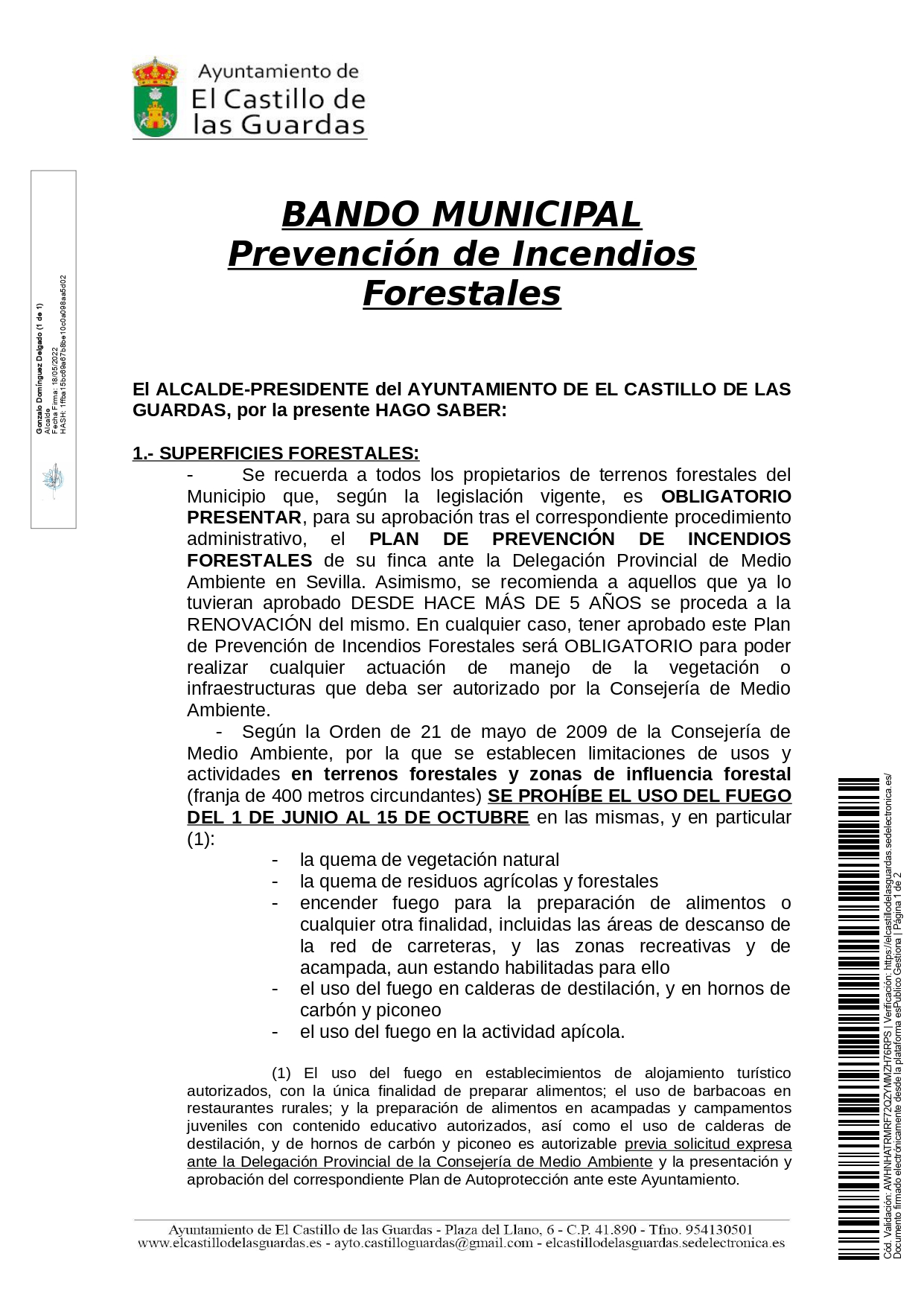 En el siguiente Bando que adjuntamos podrá encontrar toda la información sobre las obligaciones y prohibiciones que tienen los propietarios de superficies forestales, urbanizaciones, diseminados y/o construcciones aisladas referentes a la prevención de incendios forestales.
