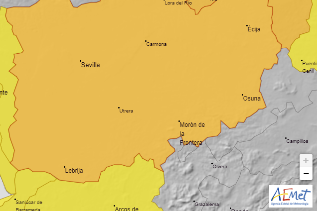 La Agencia Estatal de Meteorología establece el aviso naranja por altas temperaturas con másximas de hasta 40 ºC, hoy viernes 20 de mayo de 12.00 a 20.00 horas.