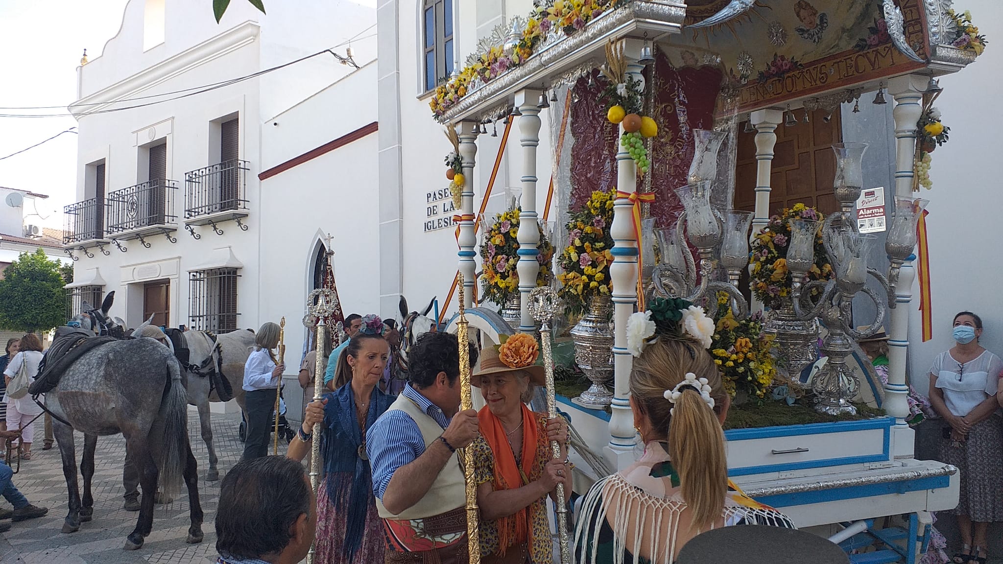 desde la C/ Ronda del Futuro , SE-9206 , Calle Cervantes , hasta la Plaza De España , continuando por la Calle Antonio Machado , hasta la Parroquia Nuestra Señora Del Rosario , deteniendonos en la misma unos 30 minutos aproximandamente. Salimos por Avenida Andalucia , para continuar por el camino popular de la Romeria , dirección Cortijo Alcalá.