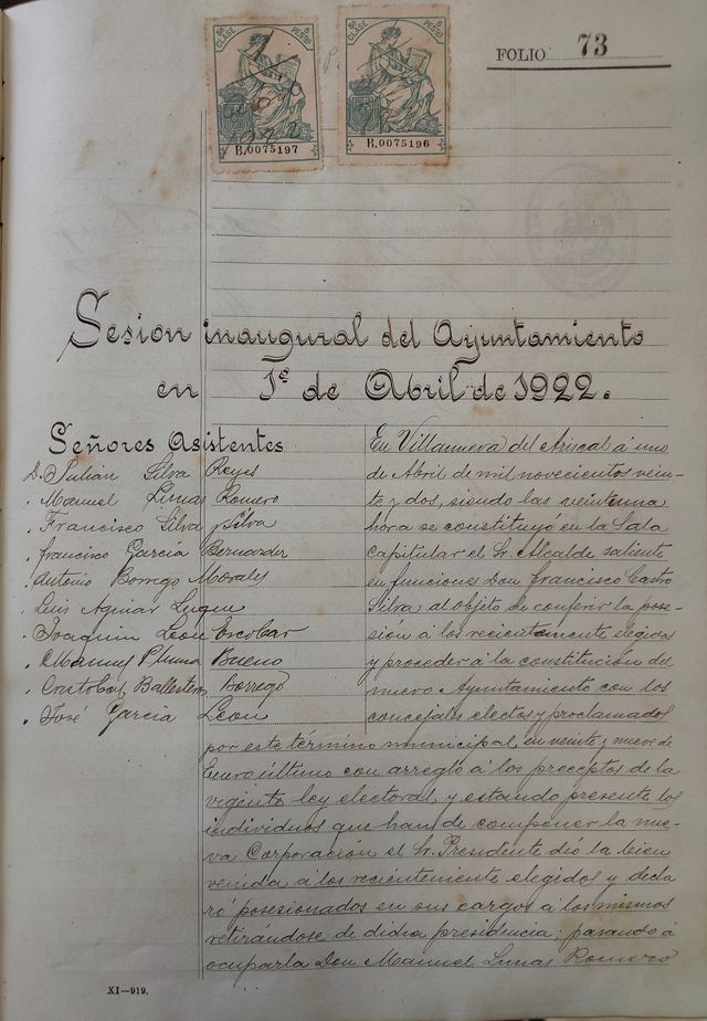 Haciendo coincidir mes y una centuria después, se nos antoja que el documento de este mes, sea esta acta: "Sesión inaugural del Ayuntamiento en 1º de abril de 1922".