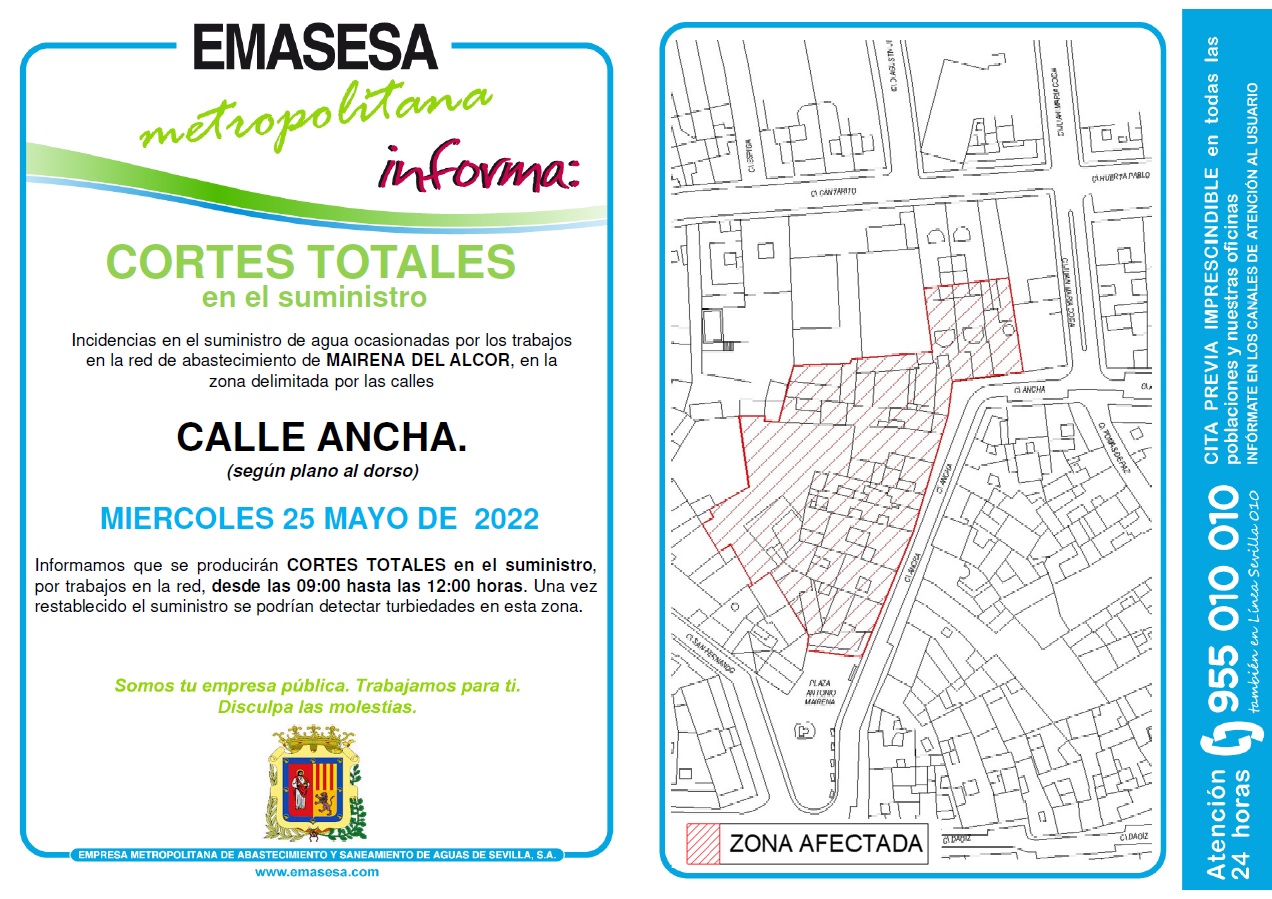 Emasesa Metropolitana informa que por trabajos en la red de abastecimiento, el miércoles 25 de mayo de 9 a 12 horas, se producirán cortes puntuales en el suministro de agua de la calle Ancha. Concretamente en los números impares del tramo que discurre desde la plaza Antonio Mairena hasta la calle Jun María Coca.