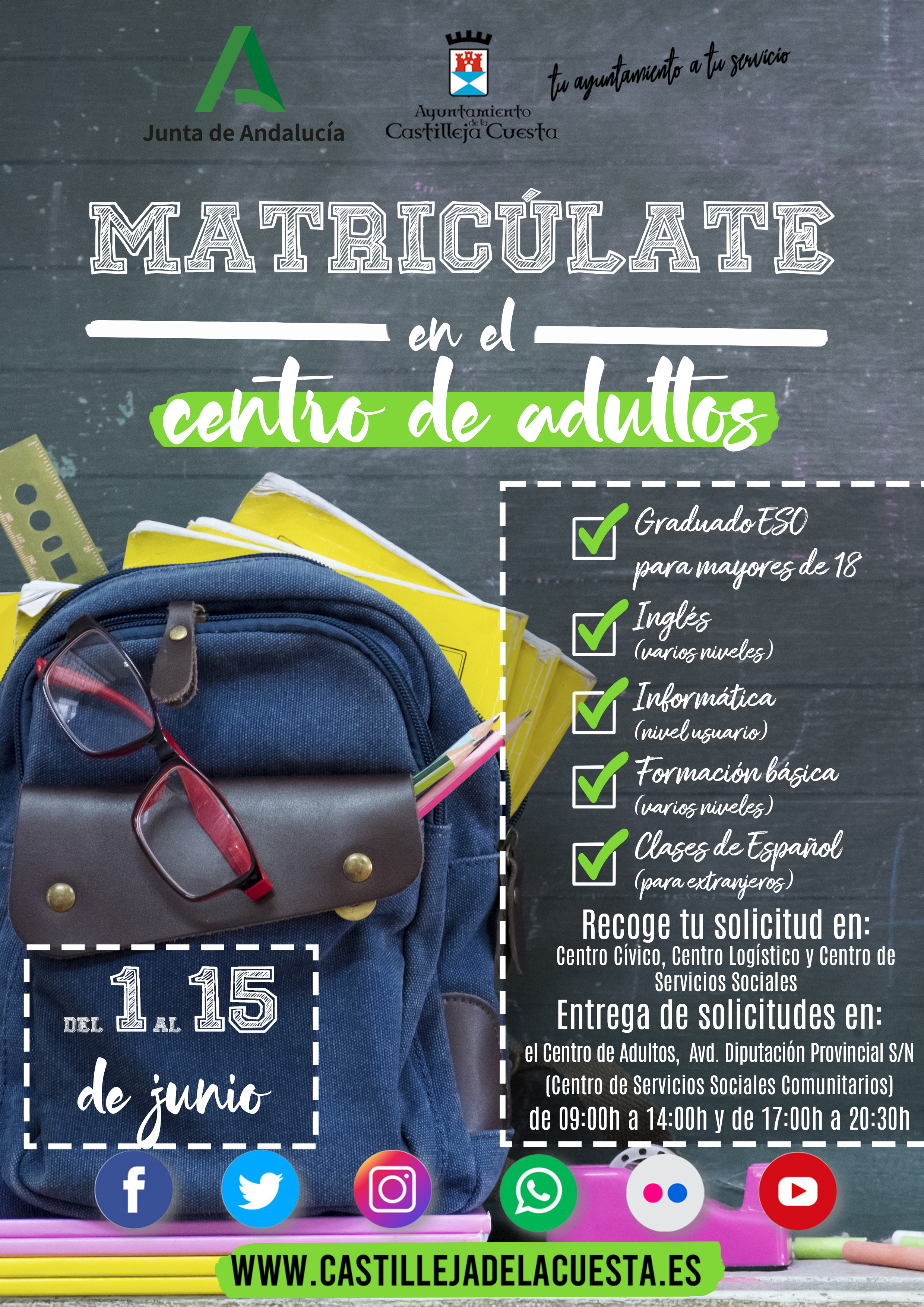 Fecha inicio Mié, 01/06/2022 - 10:28 Fecha fin Mié, 15/06/2022 - 10:28 Imágenes Ubicación Categoría evento Educación Mostrar en el carrusel de la sección No Más información http://www.castillejadelacuesta.es/es/actualidad/eventos/Matriculacion-curso-20…