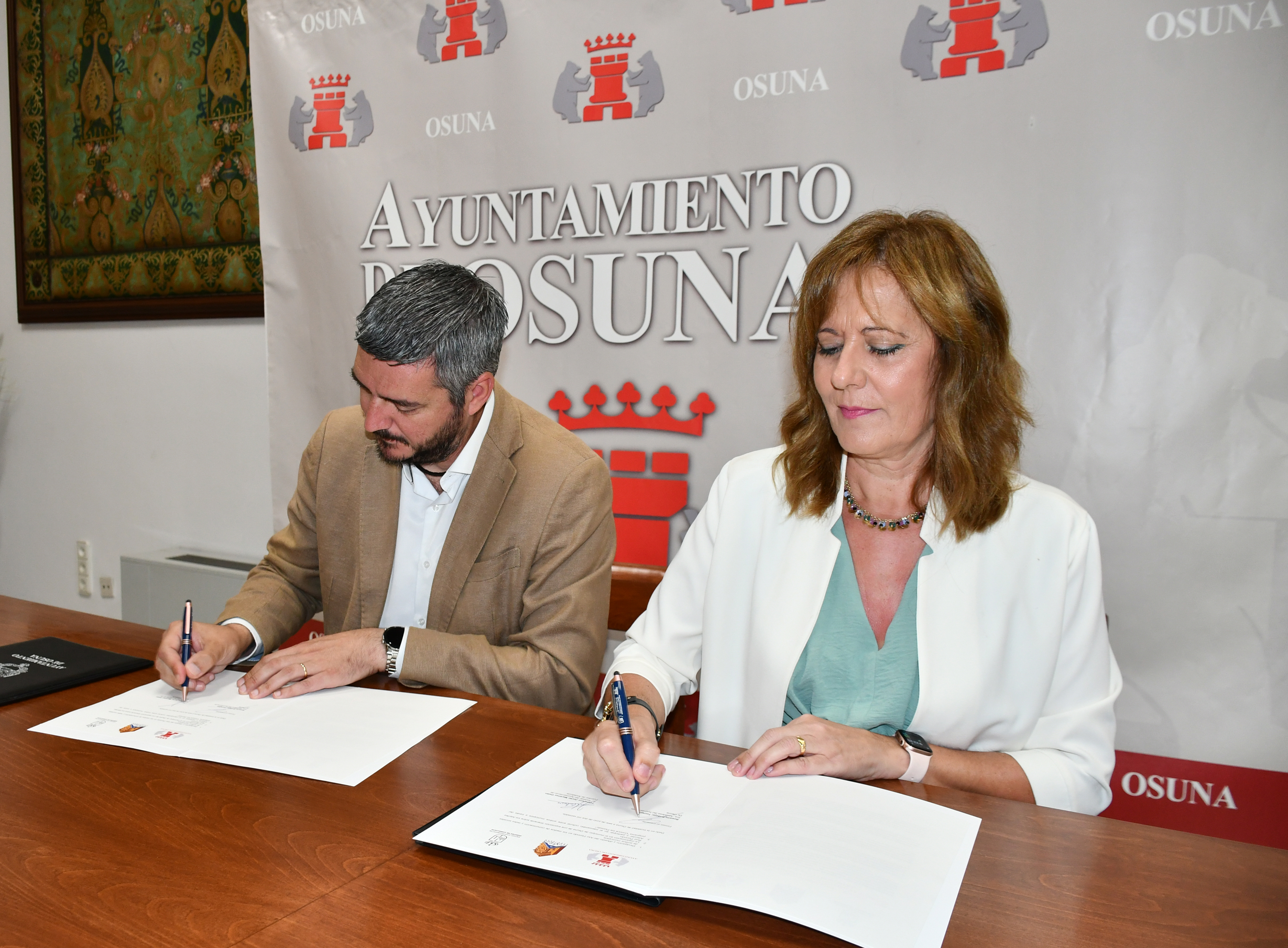 La alcaldesa de Osuna, Rosario Andújar, y el alcalde de Fuentes de Andalucía, Francisco Martínez, han firmado hoy un compromiso de adhesión con motivo de la celebración del 300 aniversario del nacimiento de Alonso Ruiz Florindo, y con el objetivo de difundir la obra arquitectónica de esta saga de arquitectos que dejaron su impronta en su localidad, Fuentes de Andalucía, y en otros muchos municipios de Sevilla, de Andalucía Occidental, y en concreto en Osuna, la fachada de la Cilla del Cabildo Catedralicio, en la calle San Pedro, y la Torre del Antiguo Convento de la Merced.