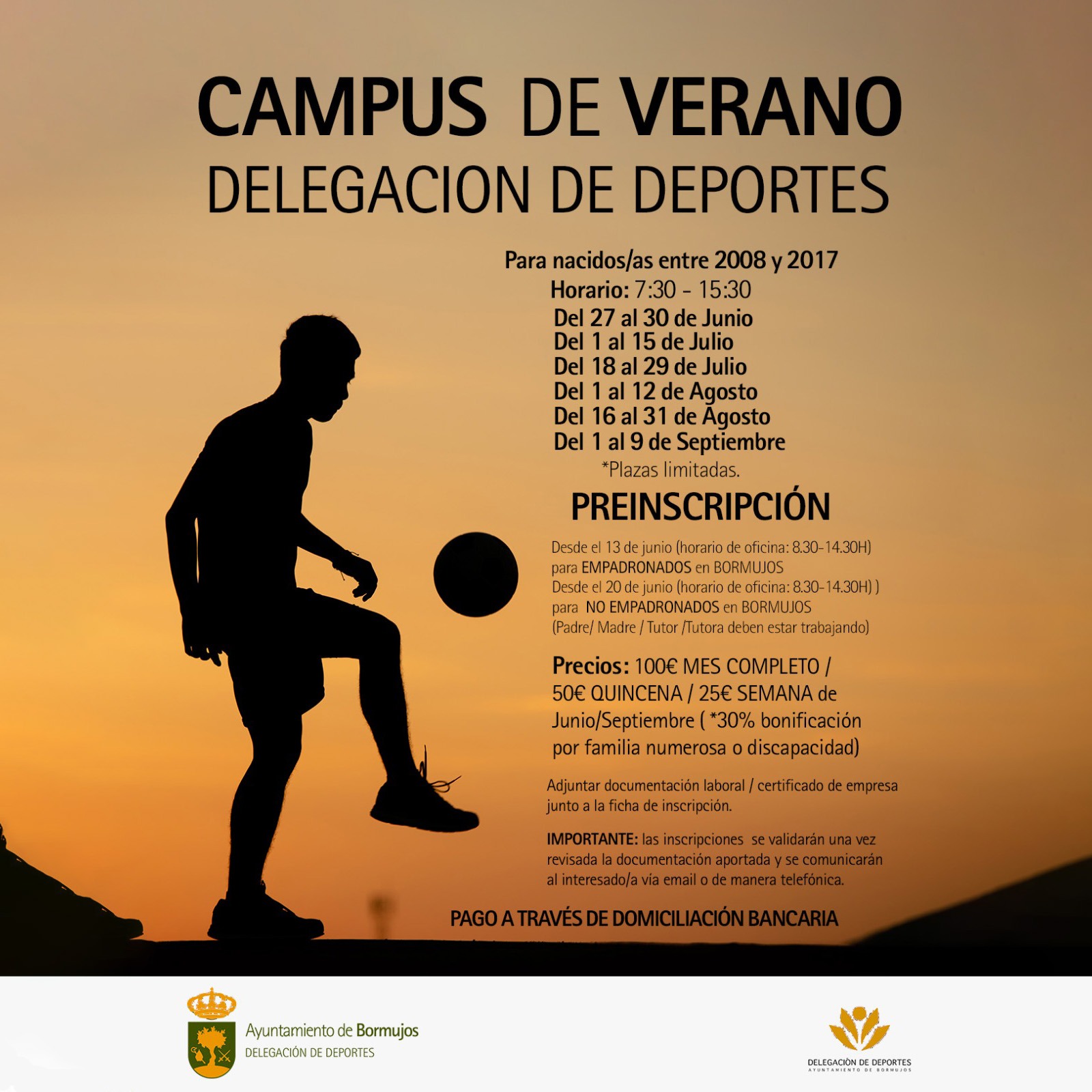 Para las inscripciones tendrán preferencia los empadronados en Bormujos pero NO será necesario aportar el certificado de empadronamiento ya que la información se cotejará a nivel interno desde la Delegación de Deportes.