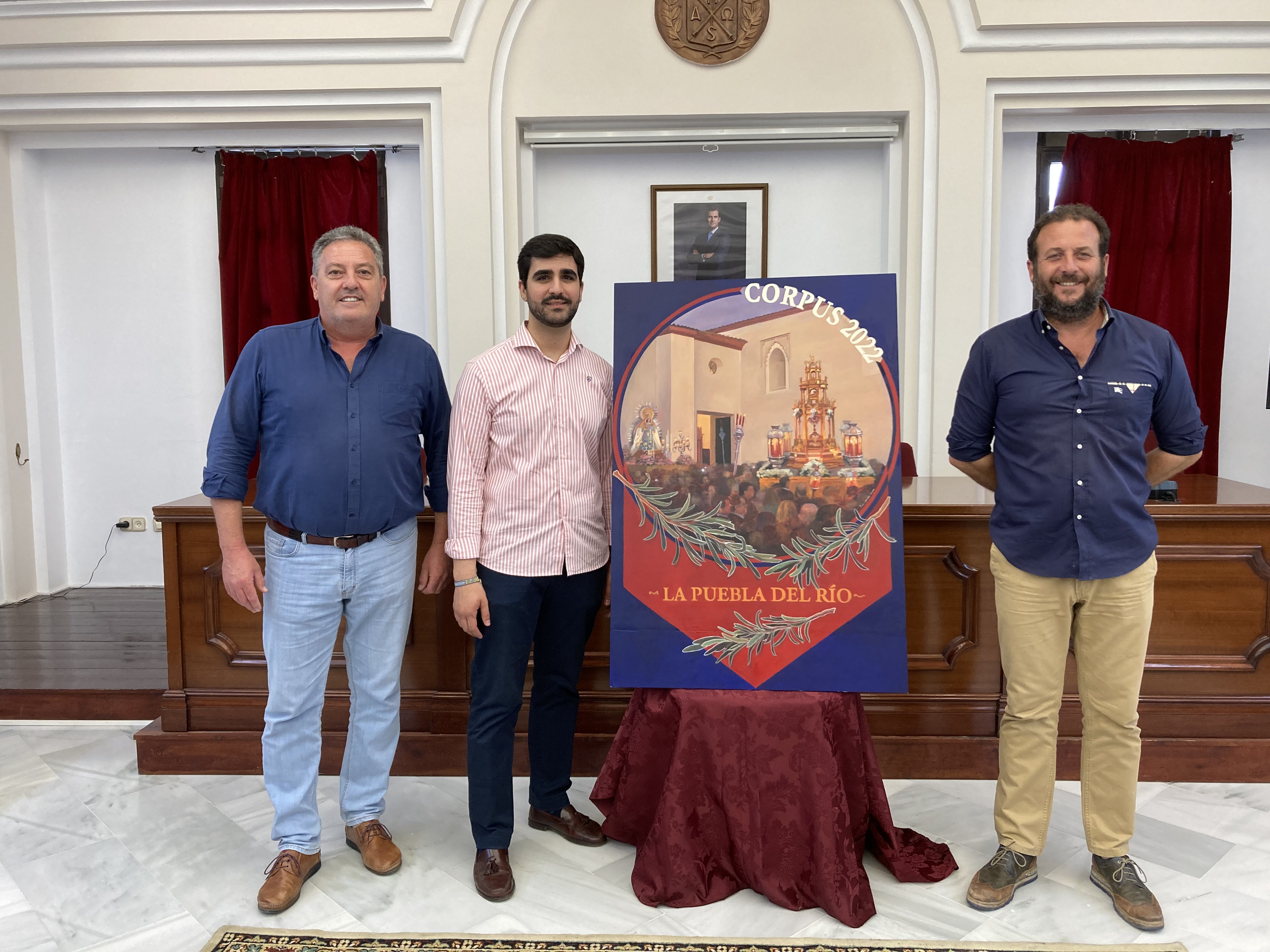 Este viernes, día 10 de junio, se ha presentado el cartel anunciador de la Feria y Fiestas del Corpus Christi 2022 de La Puebla del Río, una obra del joven artista sevillano Pedro González Vázquez. El alcalde, Manuel Bejarano; y el delegado de Cultura y Festejos, Ricardo Mateo Costales, han descubierto la obra junto al autor.