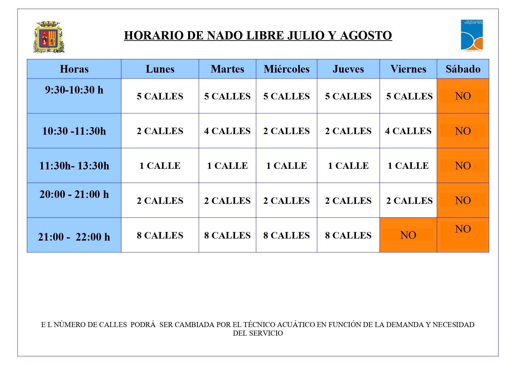 La Delegación de Deportes publica el cuadrante con los horarios y calles disponibles para la actividad de nado libre. Se imparte en horario de mañana de lunes a viernes desde las 9.30 a las 13.30 horas. Y por las tardes de lunes a jueves desde las 20 a las 22 horas y los viernes de 20 a 21 horas.