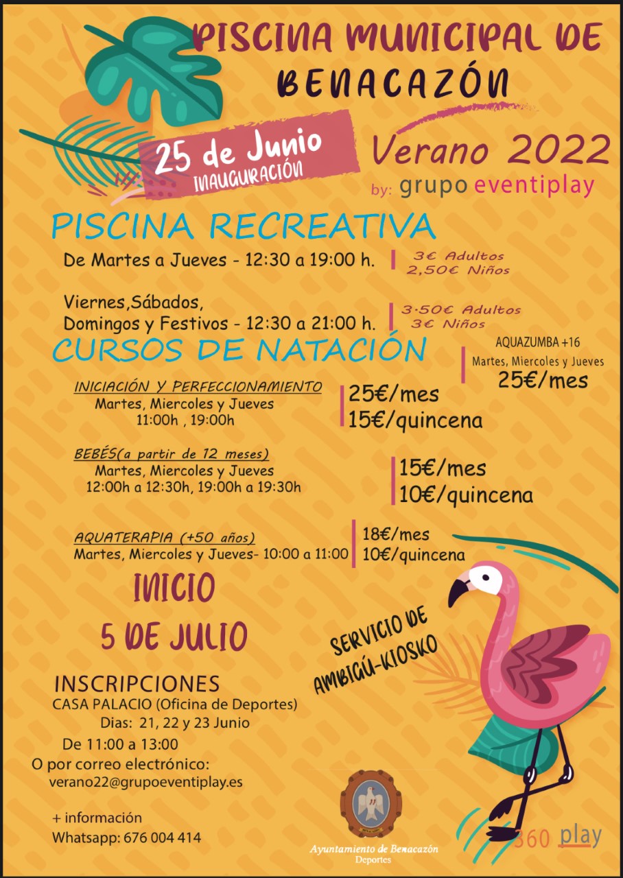Las actividades de la piscina están gestionadas por el Grupo Eventiplay, que atiende las dudas e Inscripciones a los Cursos programados de Natación en el correo electrónico verano22@grupoeventiplay.es.