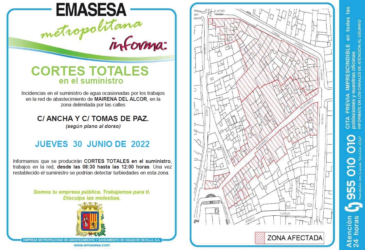 Emasesa Metropolitana informa que por trabajos en la red de abastecimiento, el jueves 30 de junio de 8.30 a 12.00 horas, se producirán cortes puntuales en el suministro de agua en las calles Ancha y Tomás de Paz. Puedes consultar las zonas afectadas en el plano.