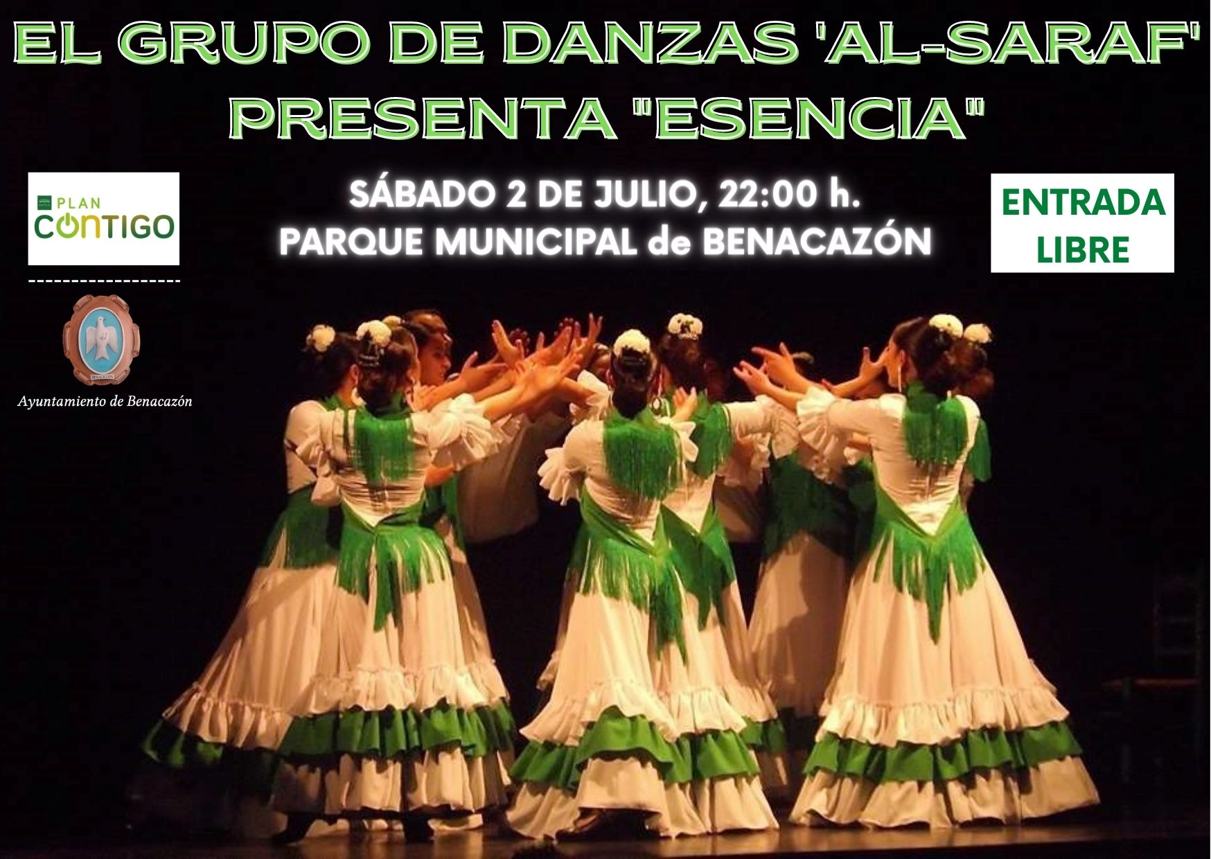 El Ayuntamiento de Benacazón informa que el próximo Sábado día 2 de Julio a las 22:00 horas podremos disfrutar en el Parque Municipal de la actuación del Grupo de Danzas AL-SARAF, que presenta el Espectáculo "ESENCIA".