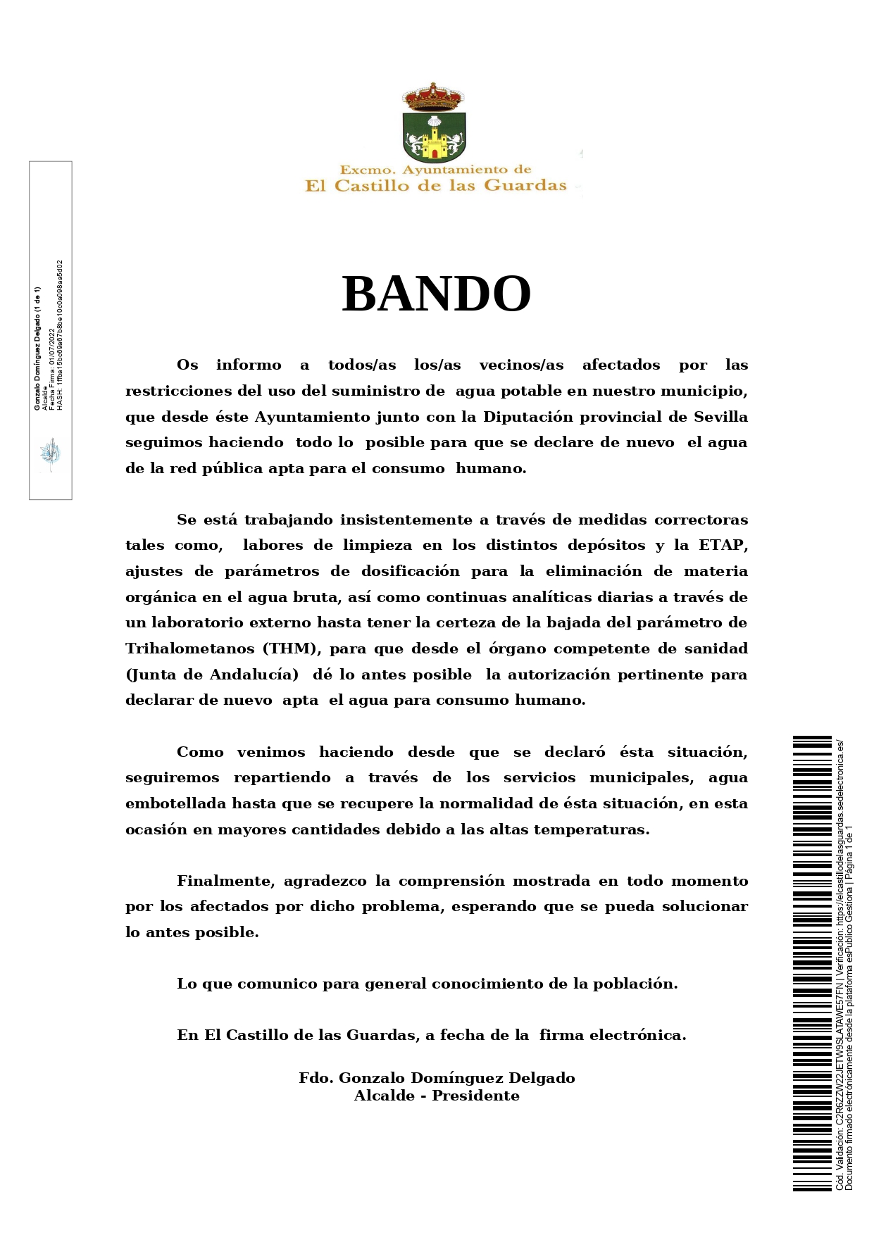 Bando de alcaldía en relación a la situación por la que atraviesa nuestro municipio en cuanto al suministro de agua potable tras decretarse que no es apta para el consumo humano.