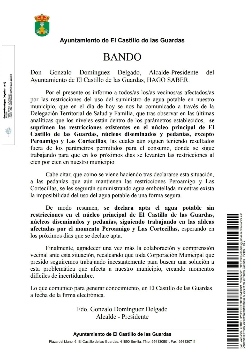 Bando de alcaldía en relación a la situación del suministro de agua potable.