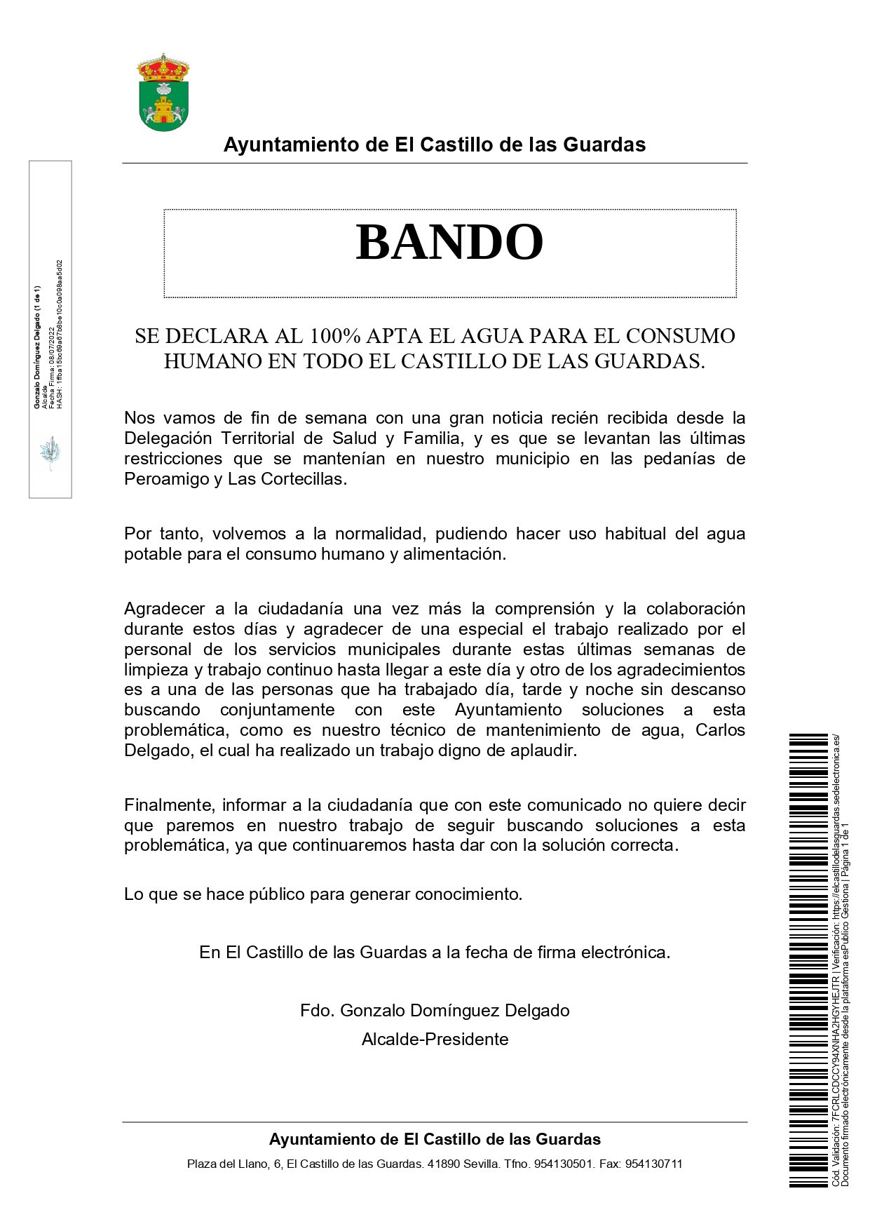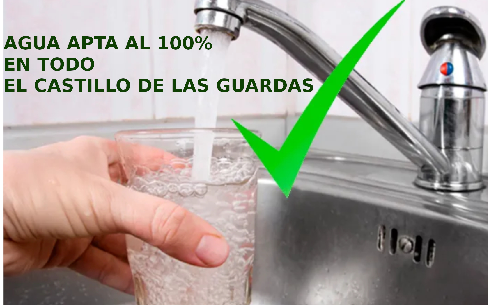 SE DECLARA AL 100% APTA EL AGUA PARA EL CONSUMO HUMANO EN TODO EL CASTILLO DE LAS GUARDAS.