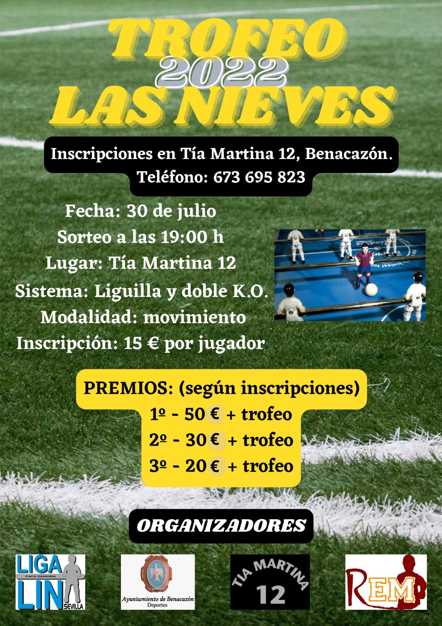 El Ayuntamiento de Benacazón informa sobre la celebración de la "TROFEO DE FUTBOLÍN LAS NIEVES 2022", en honor a la Patrona de Benacazón, organizado por la Delegación de Deportes junto con Tía Martina 12, Liga Lin y Remque, que tendrá lugar el sábado 30 de julio a partir de las 19:00 horas en Tía Martina. ABIERTA INSCRIPCIÓN HASTA EL 30 DE JULIO. Trofeo y Premios de 50, 30 y 20 euros a los 3 primeros clasificados.