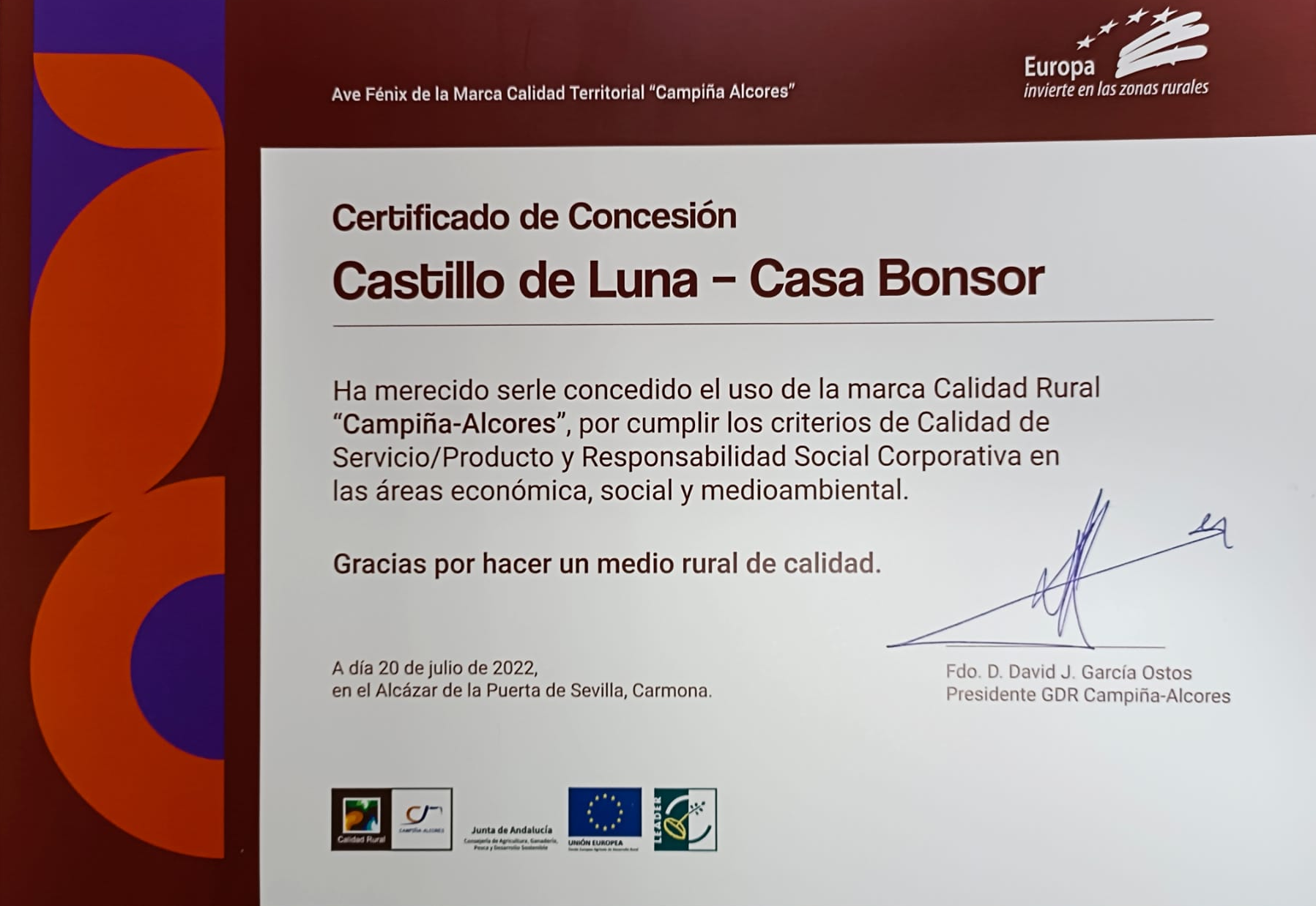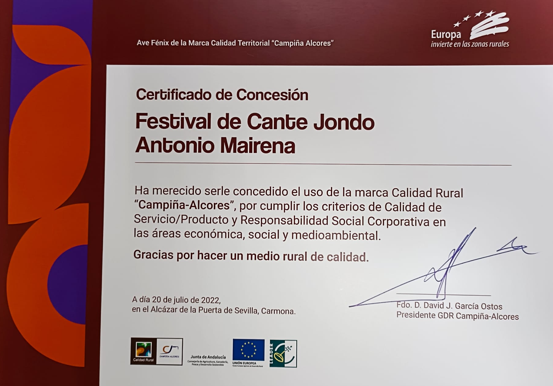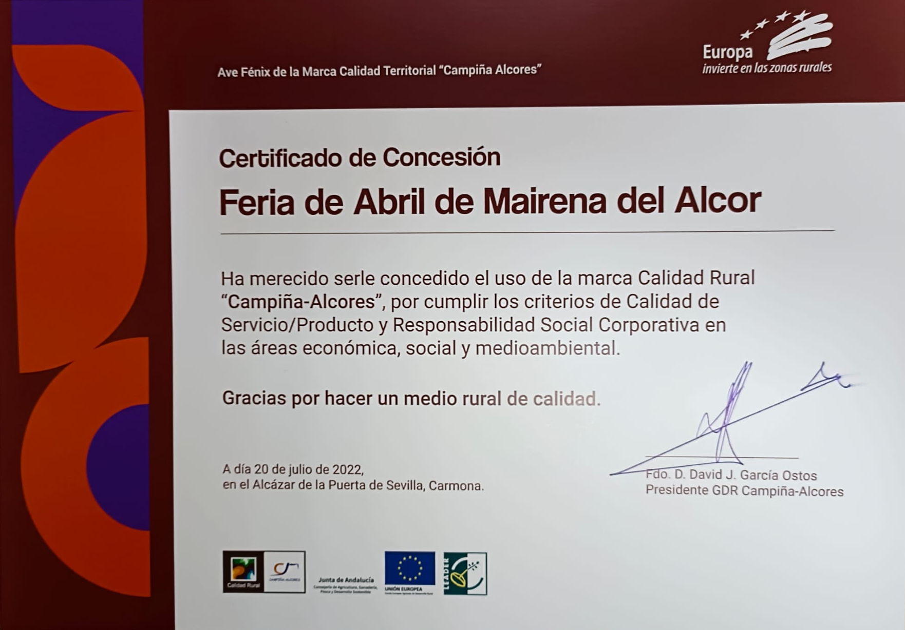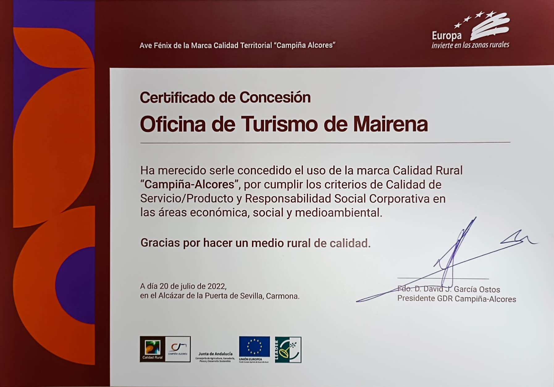 Mairena del Alcor ha recibido 6 certificaciones: las empresas Aceitunas Rumarín SL y Agromairena SA; el Castillo de Mairena, la Feria de Abril, el Festival de Cante Jondo Antonio Mairena y la Oficina de Turismo. Estas 4 últimas concedidas en el año 2015 por el Grupo de Desarrollo Rural Campiña-Alcores.