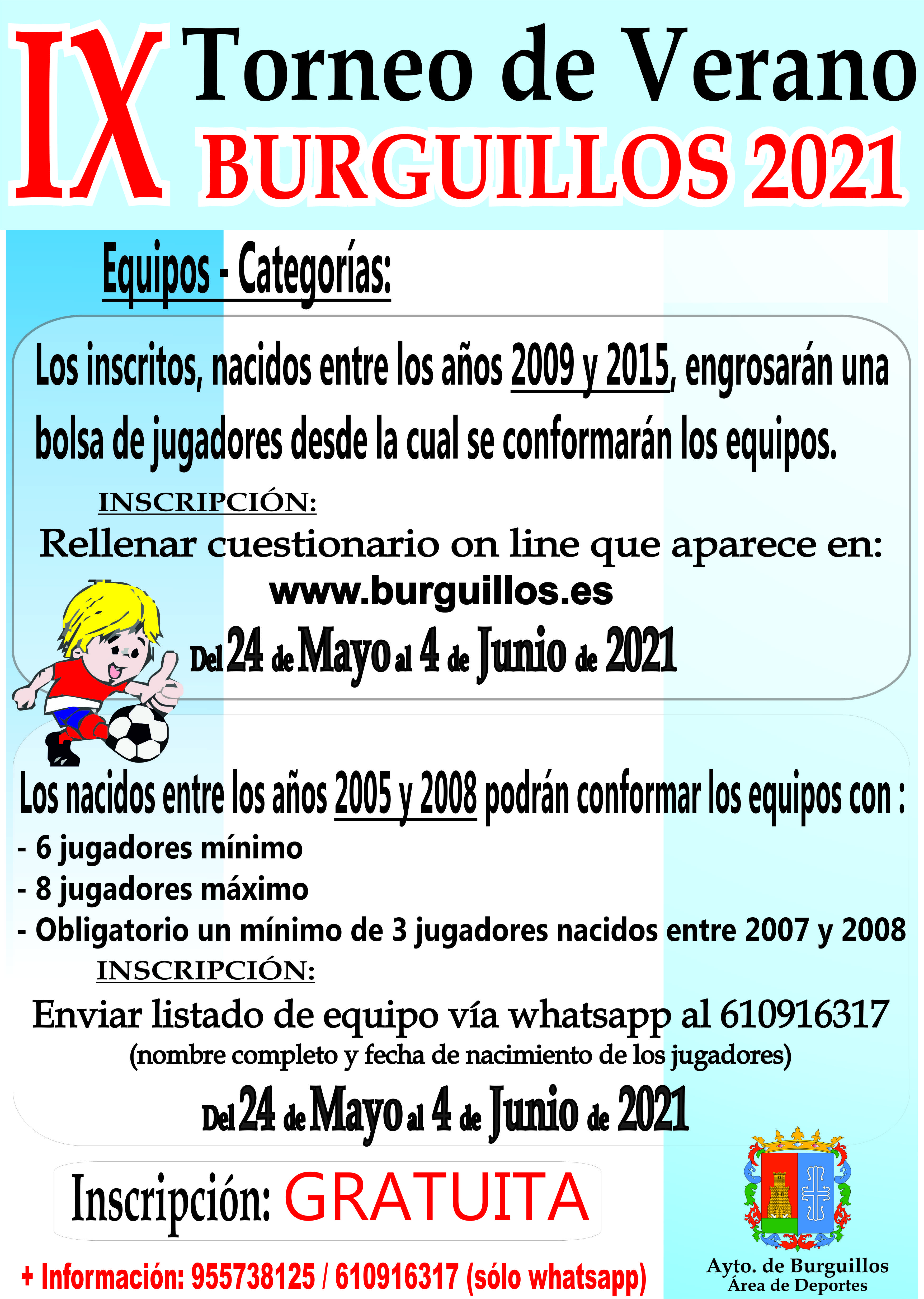 Habrá diferentes categorías en función de la edad y número de inscritos. La inscripción se hará de dos formas distintas: a.- Los nacidos entre 2009 y 2015 lo harán a través de un formulario que deben rellenar en el "link siguiente". b.- Los nacidos entre 2005 y 2008 lo harán vía whatsapp al 610916317, indicando el nombre del equipo y los datos: nombre, apellidos, fecha de nacimiento y talla de camiseta de cada jugador. El calendarios y demás información se comunicará el 9 de junio de 2021.Imagen