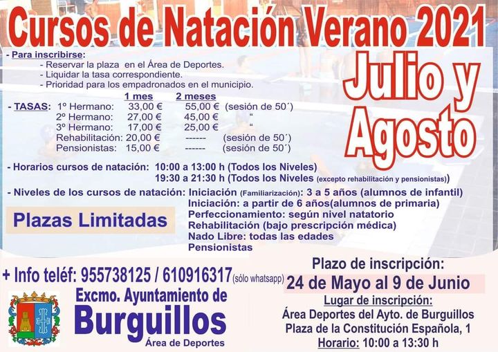 El próximo lunes 24 de mayo se abre el plazo de inscripción para los cursos de natación del próximo verano. Para realizar la inscripción hay que dirigirse al Área de Deportes del Ayuntamiento de Burguillos en horario de 10:00 - 13:30. ¡¡Os esperamos!!