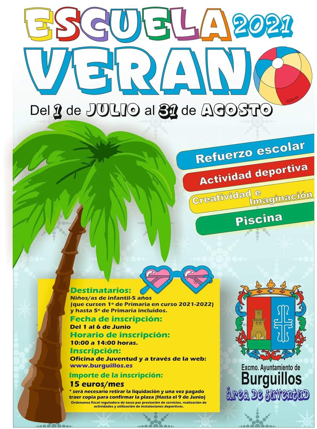 Vuelve la Escuela de Verano los meses de Julio y Agosto. Con todas las medidas sanitarias y con toda la seguridad necesaria, los niños y niñas de Burguillos volverán a disfrutar de juegos, talleres, deportes, piscina y mil sorpresas más que estamos planificando.