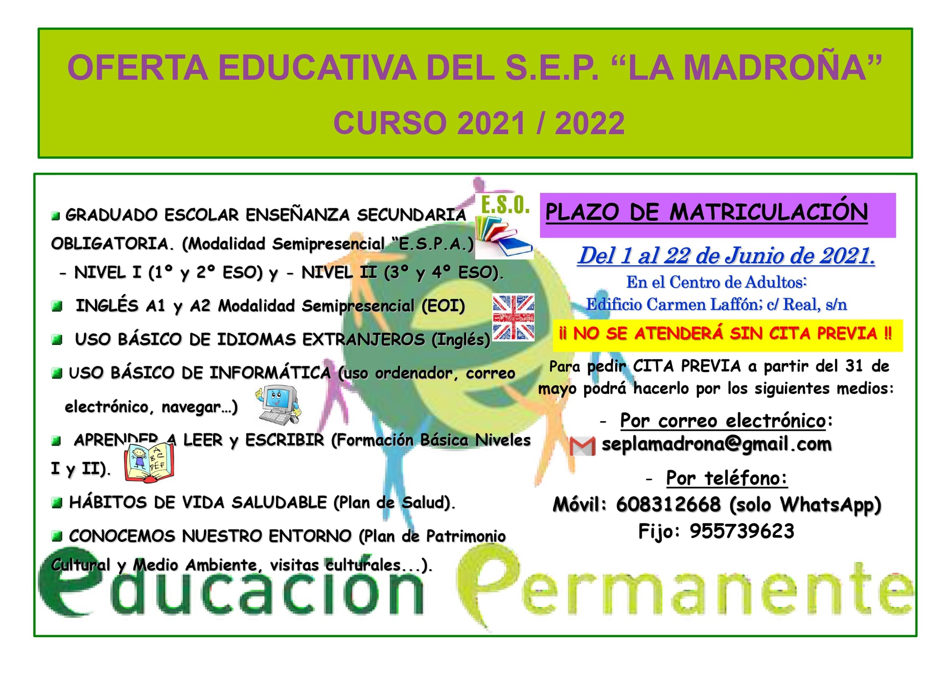 Os mostramos la oferta educativa del S.E.P. "La Madroña" para el curso 2021-2022. El plazo de matriculación comienza hoy día 1 de junio y finaliza el martes 22 del mismo mes.