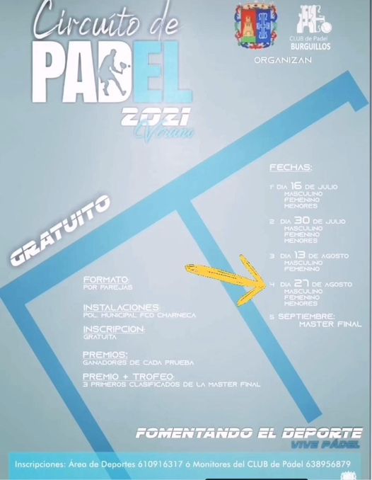 Abierta la inscripción para la cuarta sesión del Circuito de Pádel de Burguillos. Todos aquellos burguilleros que deseen inscribirse pueden hacerlo a través del Área de Deportes del Ayuntamiento de Burguillos (610916317) o a través del Club de Pádel (638956879). ¡¡Os esperamos!! #MásBurguillos #MásDeporte
