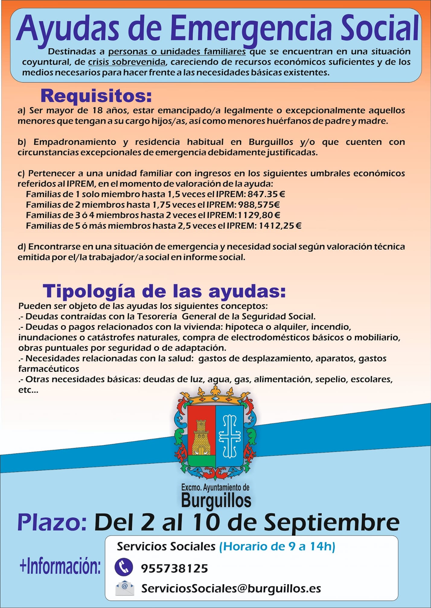 Abierto el plazo de solicitud para las ayudas destinadas a personas o unidades familiares que se encuentran en una situación coyuntural, de crisis sobrevenida, careciendo de recursos económicos suficientes y de los medios necesarios para hacer frente a las necesidades básicas existentes. El plazo de presentación de solicitudes será del 2 al 10 de Septiembre.