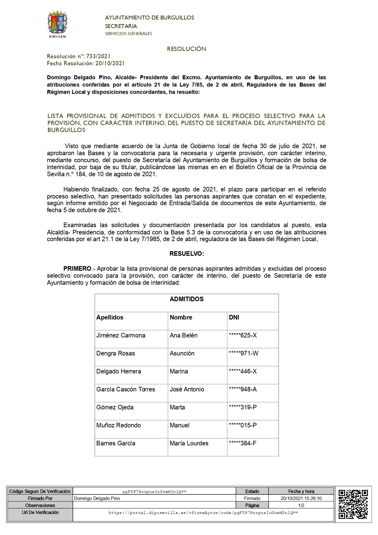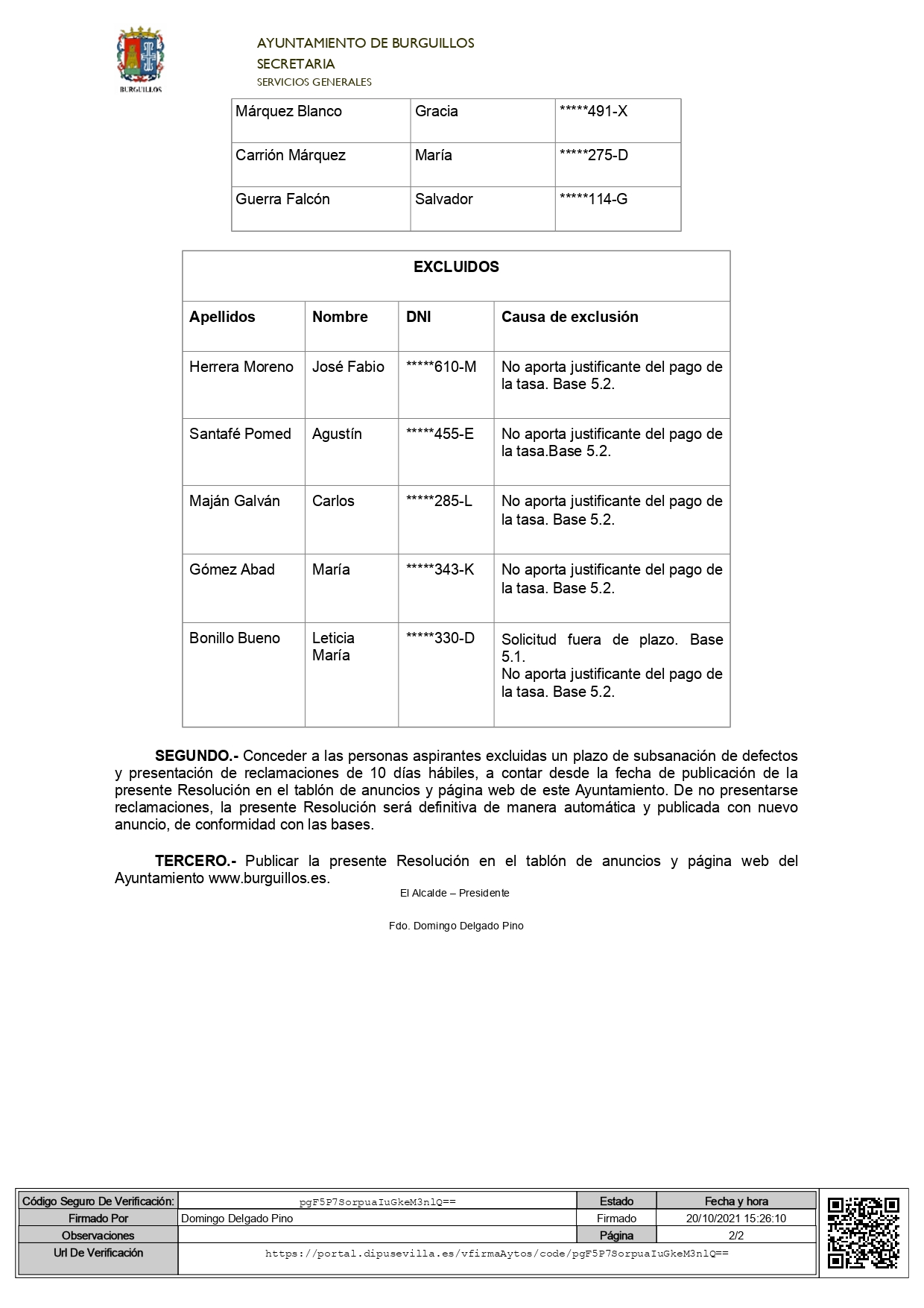 Alcaldía- Presidencia, de conformidad con la Base 5.3 de la convocatoria y en uso de las atribuciones