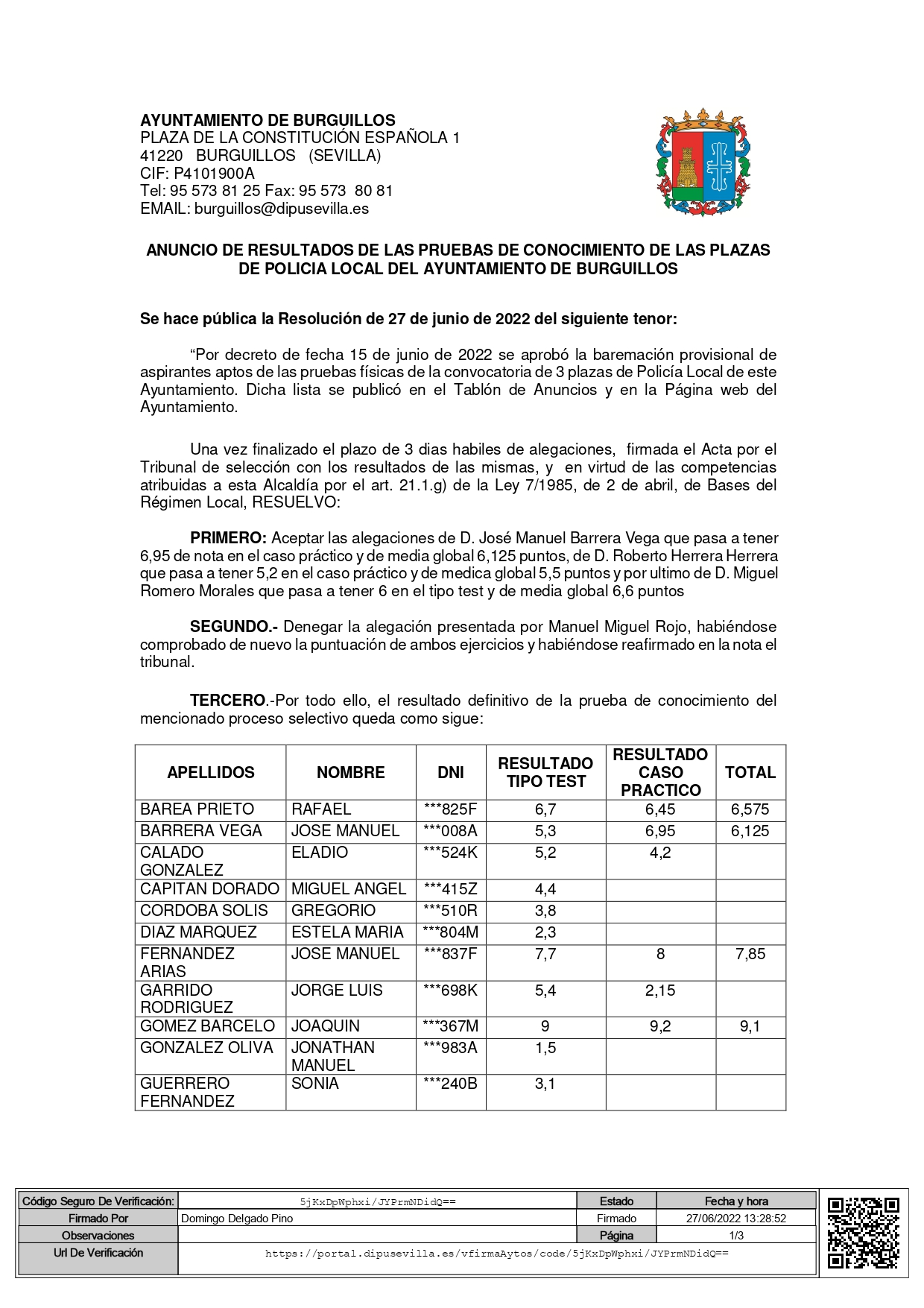 "Por decreto de fecha 15 de junio de 2022 se aprobó la baremación provisional de aspirantes aptos de las pruebas físicas de la convocatoria de 3 plazas de Policía Local de este Ayuntamiento. Dicha lista se publicó en el Tablón de Anuncios y en la Página web del Ayuntamiento.