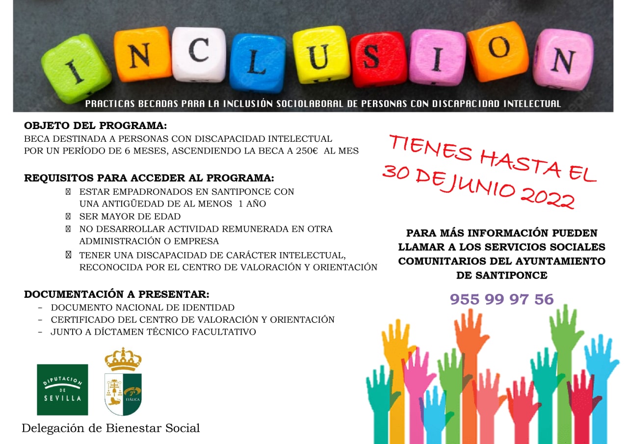 Hasta el 30 de junio puede solicitar presencialmente en el Ayuntamiento de Santiponce una beca para favorecer la inclusión socio-laboral de personas con discapacidad intelectual. Esta ayuda se otorgará durante un periodo comprendido entre seis y doce meses.