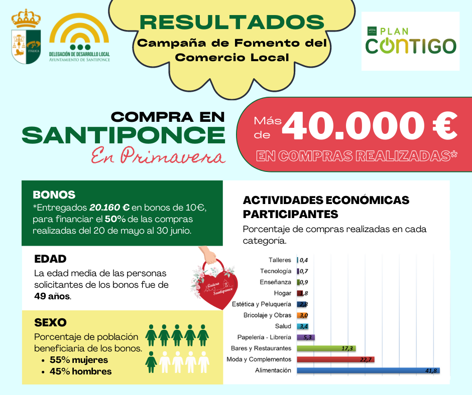 El Ayuntamiento de Santiponce impulsa las compras en el municipio mediante la entrega de 20.160€ en bonos de 10€ a los/as vecinos/as para consumir productos y/o servicios en el comercio local. Alrededor de 70 establecimientos participantes obtuvieron un beneficio en compras de más de 40.000€ (50% financiado por el Ayuntamiento de Santiponce).