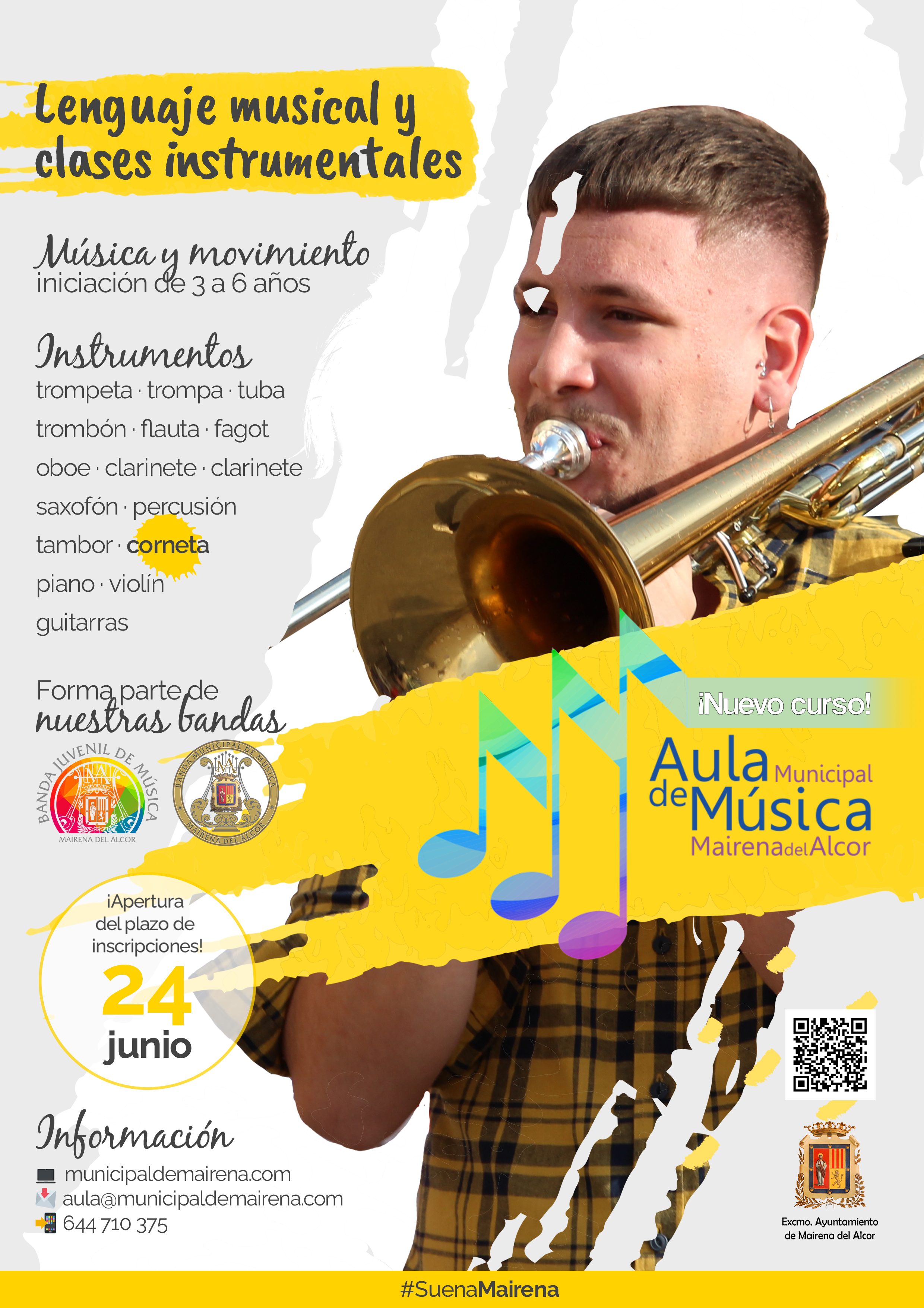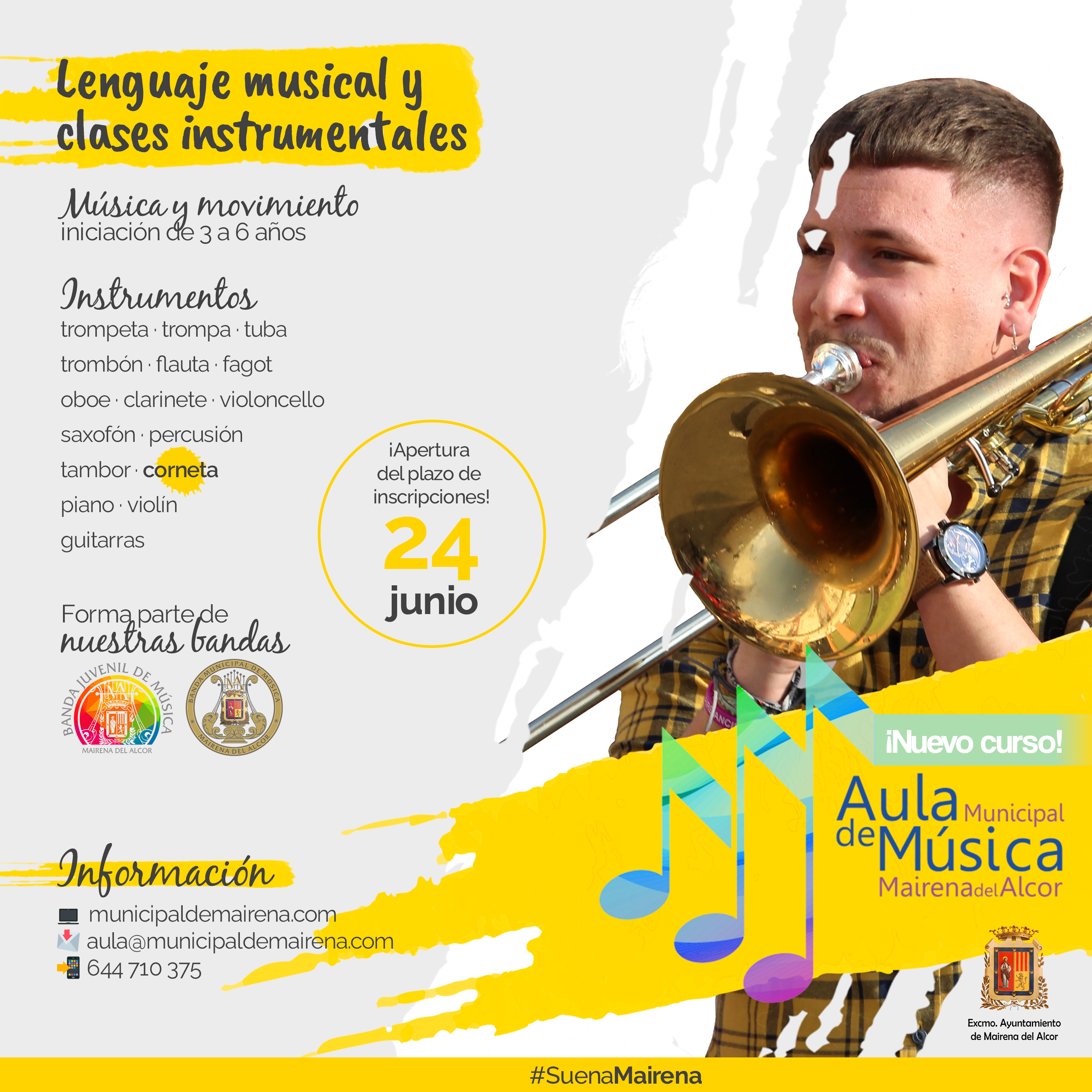 ¿Te gusta la música ¿Quieres aprender a tocar algún instrumento? Abre el plazo de matriculación al curso 2022-2023 del Aula Municipal de Música de Mairena del Alcor, hasta el 13 de septiembre en el Centro Cívico Antonio Machado.