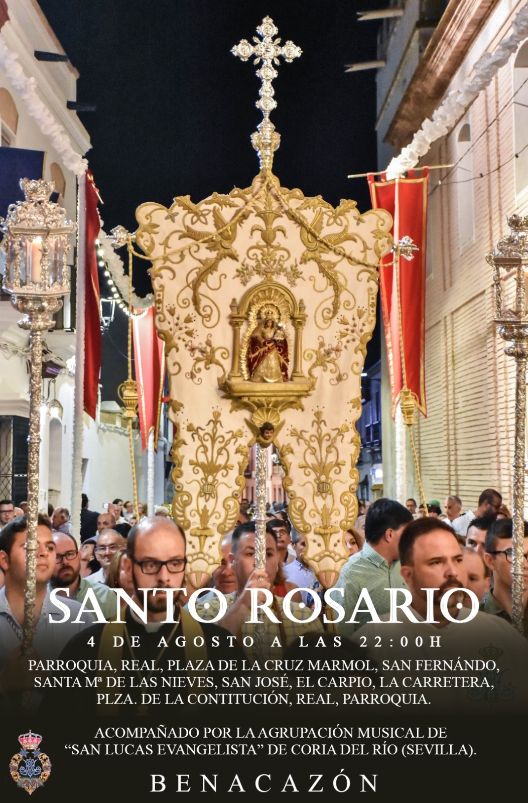 El Ayuntamiento de Benacazón informa que el jueves 4 de Agosto, vísperas del Día de Nuestra Patrona, celebraremos el REZO DEL SANTO ROSARIO por las calles de nuestro pueblo, presidido por el Simpecado de la Santísima Virgen de las Nieves.