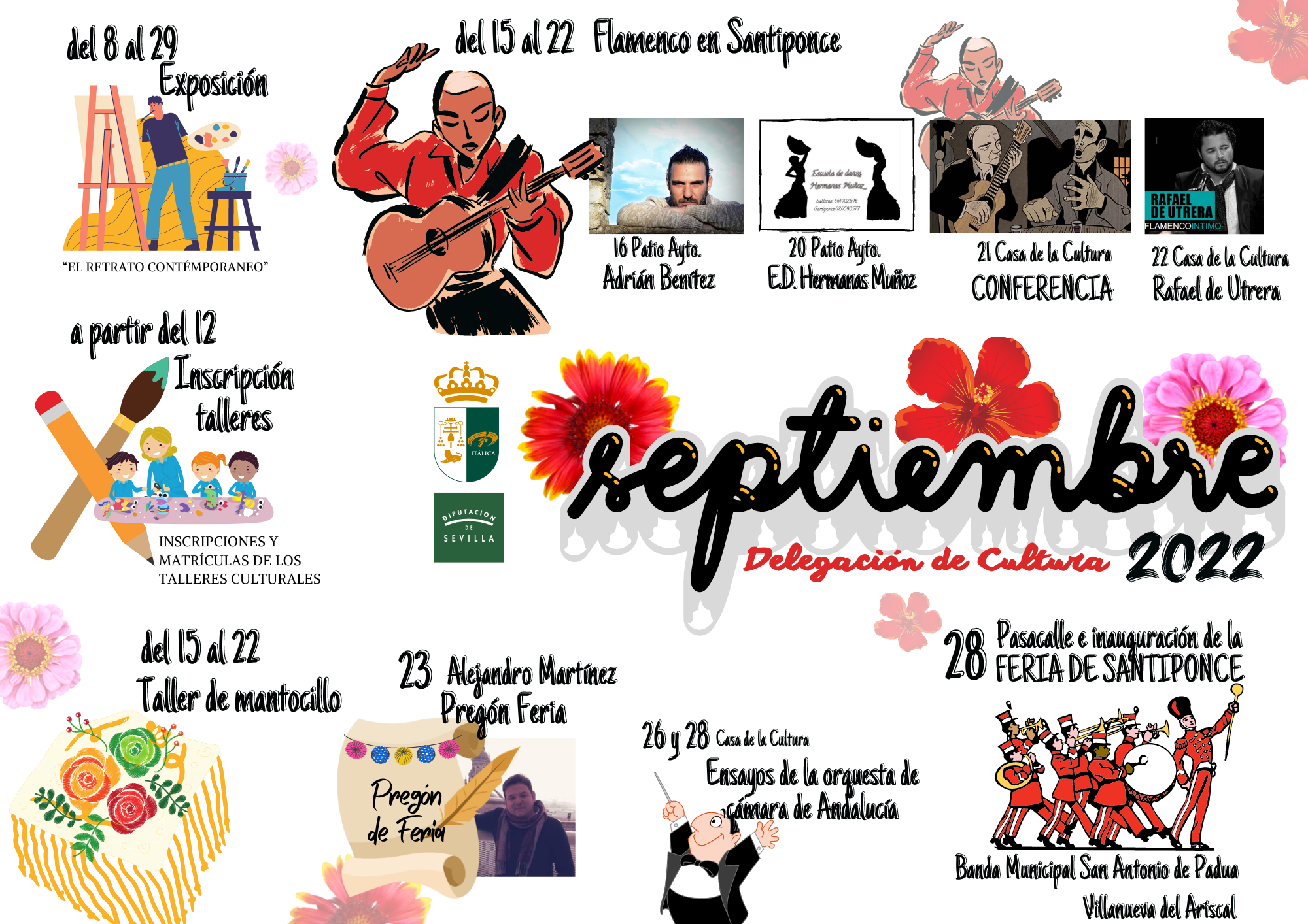 Celebra el mes de septiembre participando de nuestro calendario cultural, que viene cargado con exposiciones, conferencia, talleres, Pregón de Feria y mucha música.