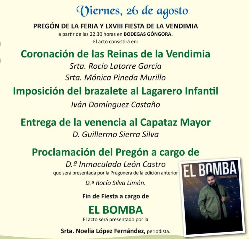 Esta noche disfrutaremos del Pregón de la LXVIII Fiesta de la Vendimia a cargo de nuestra vecina Inmaculada León Castro. Fin de fiesta con El Bomba.