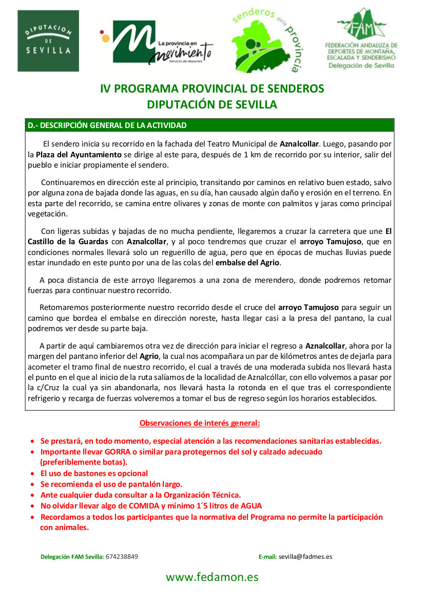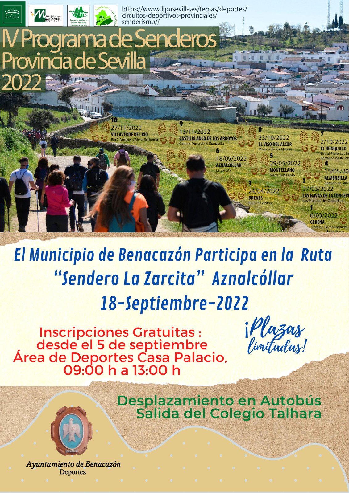 El Ayuntamiento de Benacazón informa sobre la próxima ruta de senderismo "SENDERO DE LA ZARCITA" que se realizará el próximo domingo 18 de septiembre, como parte del IV PROGRAMA DE SENDEROS DE LA PROVINCIA DE SEVILLA, organizado por Diputación.