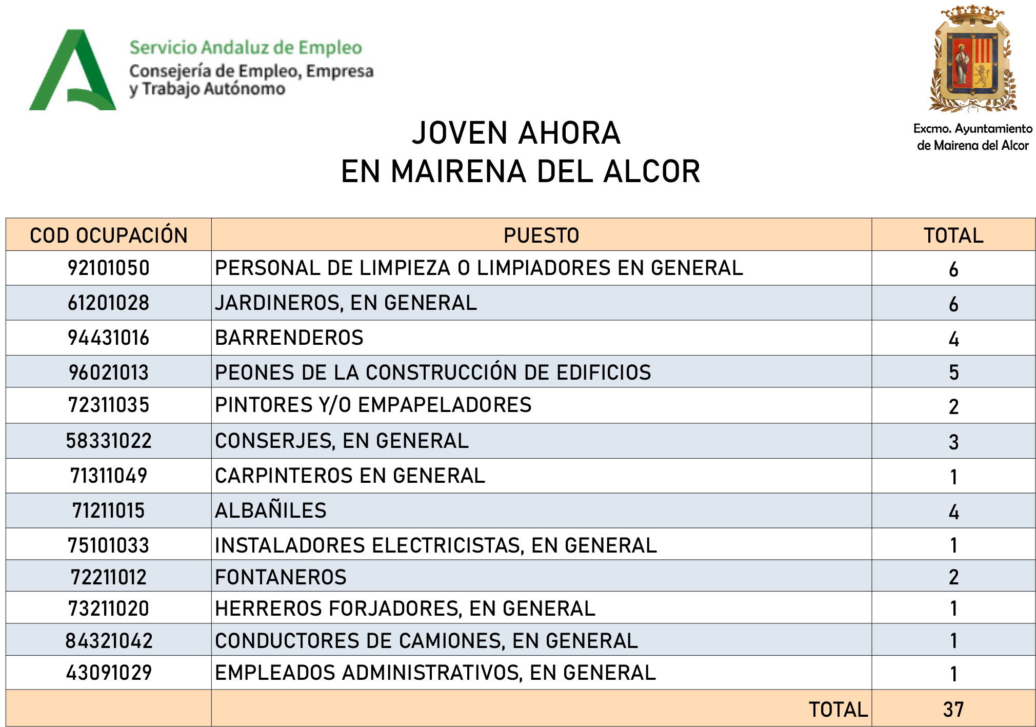 La delegación pone en marcha un nuevo programa de empleo, Joven Ahora, con 37 plazas dirigidas a jóvenes entre 18 y 29 años que trabajarán 6 meses a jornada completa en el Ayuntamiento. Es necesario que acudan a la oficina del SAE para cumplir como requisitos estar inscritos como demandantes de empleo en el Sistema de Garantía Juvenil e insribirse en los perfiles requeridos:
